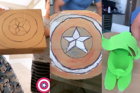 Algumas horas depois, Claudia volta e mostra o resultado que é de deixar qualquer um de queixo caído! Os meninos colocaram um suporte feito de papel EVA verde para colocar o braço e formar o escudo. Além de exibir o desenho pintado nas cores vermelho, prata e azul. Uau! “Aqui nossa primeira obra de arte que fizemos! Muito massa. Temos que fazer um canal no Youtube para ensinar a fazer”, brinca Claudinha. E tem mesmo! Dá uma olhada no resultado: