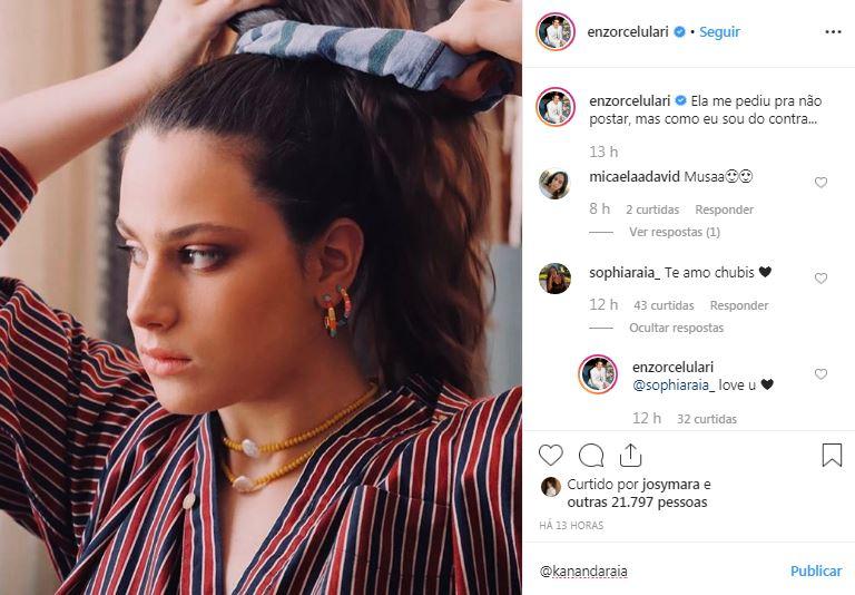 Na segunda-feira, 25 de novembro, Enzo Celulari surpreendeu os seguidores ao publicar uma foto da irmã, Sophia Raia. “Ela me pediu pra não postar, mas como eu sou do contra…”, disse na legenda da publicação. Sophia comentou, se declarando para o irmão: “Te amo, chubis”.