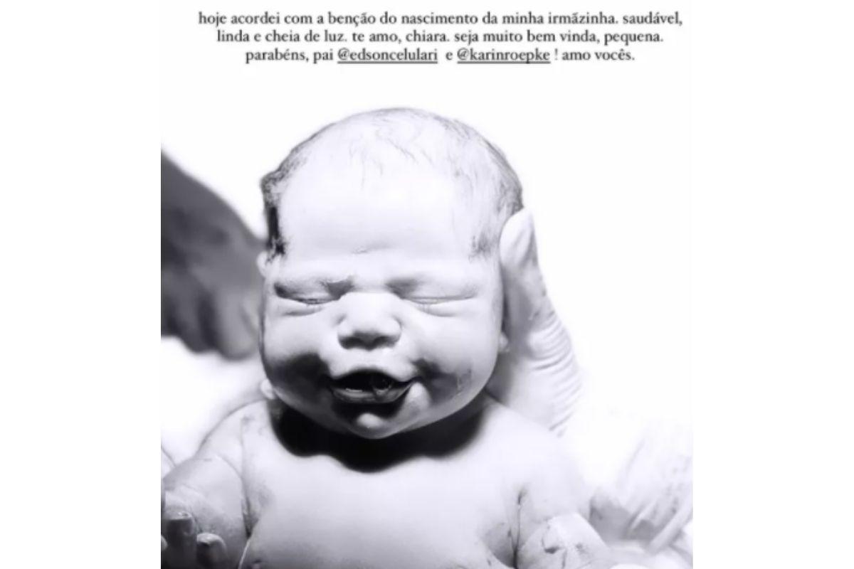 “Acordei com a benção do nascimento da minha irmãzinha. Saudável, linda e cheia de luz. Te amo, Chiara. Seja muito bem-vinda, pequena. Parabéns, pai e Karin. Amo vocês!”, escreveu ele nos stories das redes sociais.