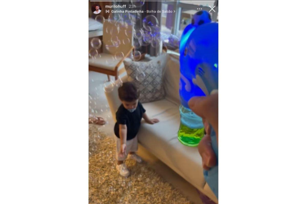 Nos stories, ele aparece brincando com o filho. Leo corre para abraçar o pai e em seguida eles começam a brincar de bolhas de sabão pela sala.