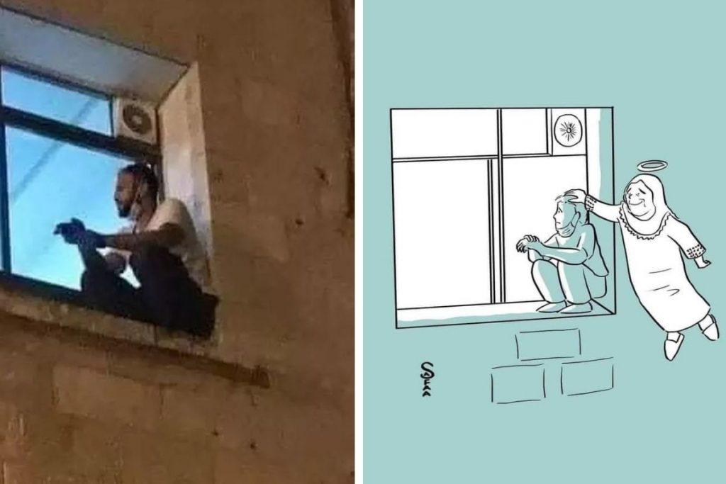 Uma cena chamou a atenção e emocionou o mundo todo nesta semana. Na foto, um homem aparece agachado no parapeito da janela de um prédio, olhando para dentro, com uma máscara abaixada. A verdadeira história por trás da imagem é uma aula de amor e aconteceu na cidade de Beit Awwa, na Cisjordânia.