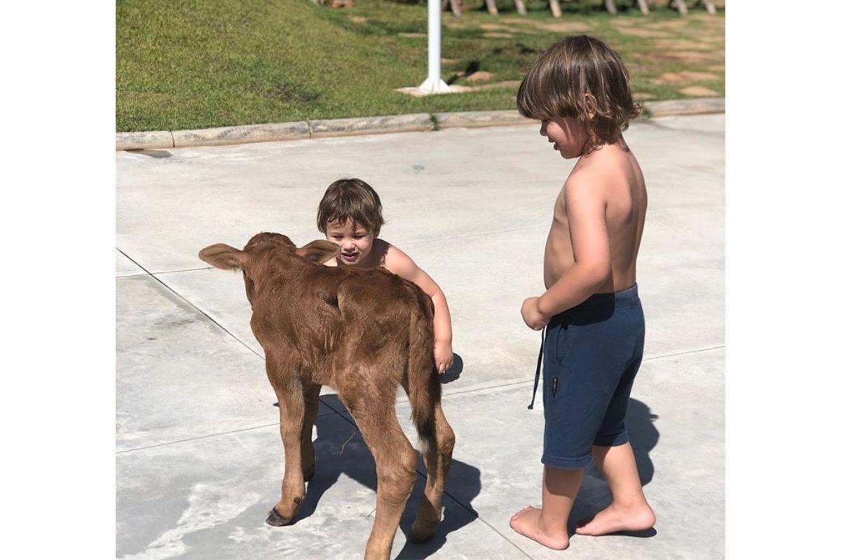 Gusttavo Lima e a esposa, a modelo Andressa Suita, são pais dos meninos Gabriel, de 2 anos, e Samuel, de 1 ano. Recentemente, os garotos apareceram cuidando de um dos animais de estimação que possuem na fazenda de Goiás, um bezerro.
