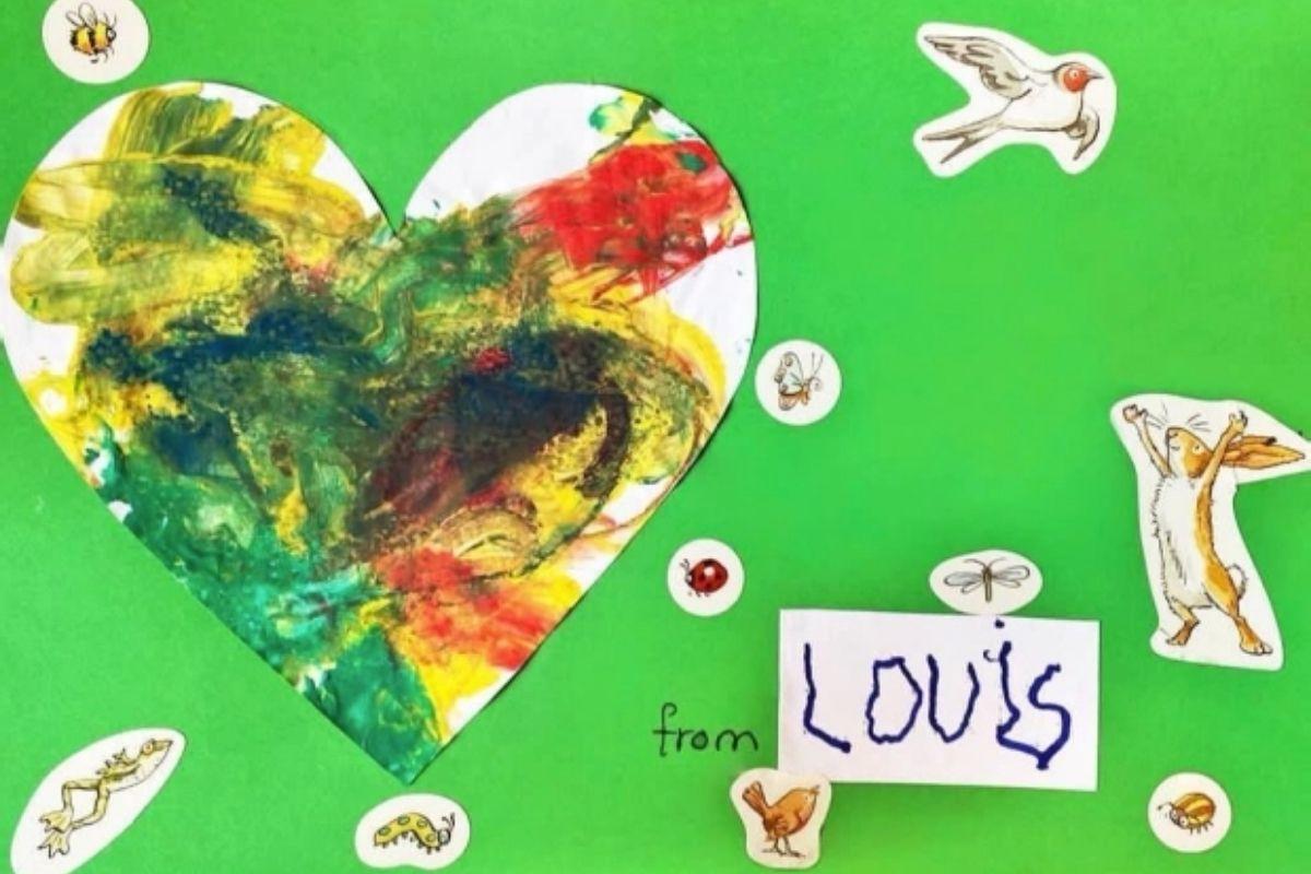 Adoravelmente Charlotte colou no papel rosa fotos de borboletas, flores e a dançarina Angelina Ballerina. Enquanto isso, Louis, de dois anos, simplesmente escreveu o próprio nome acompanhado de um coração. O primogênito também fez um desenho para a avó que ele não chegou a conhecer – em giz de cera ele pintou árvores, montanhas e flores.