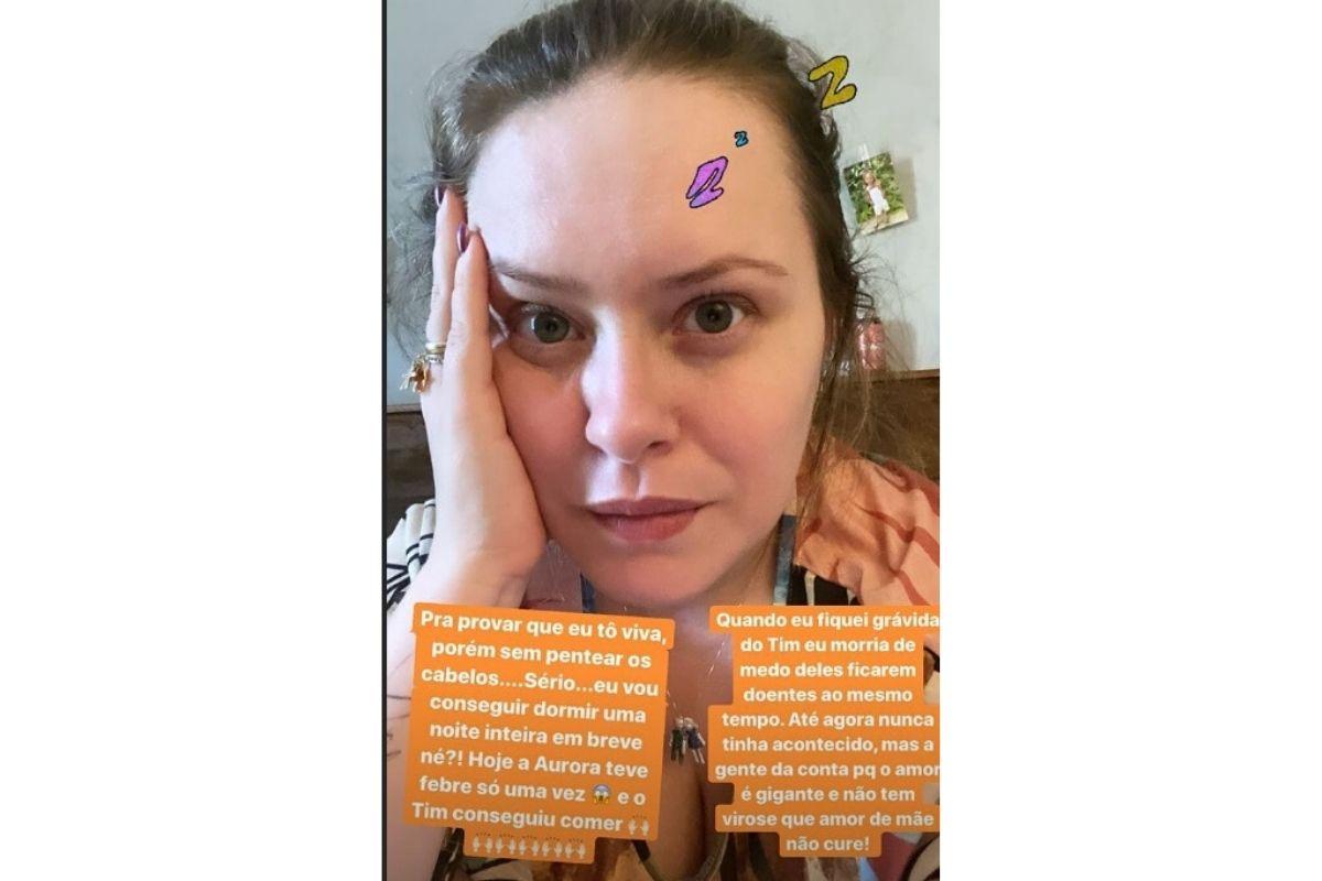Ela iniciou o relato falando o porque não estava aparecendo muito na internet: “Gente eu sei que eu estou sumida, mas dois filhos doentes… Pra provar que eu tô viva, porém sem pentear os cabelos…Sério…eu vou conseguir dormir uma noite inteira em breve né? Hoje a Aurora teve febre só uma vez e o Tim conseguiu comer”.