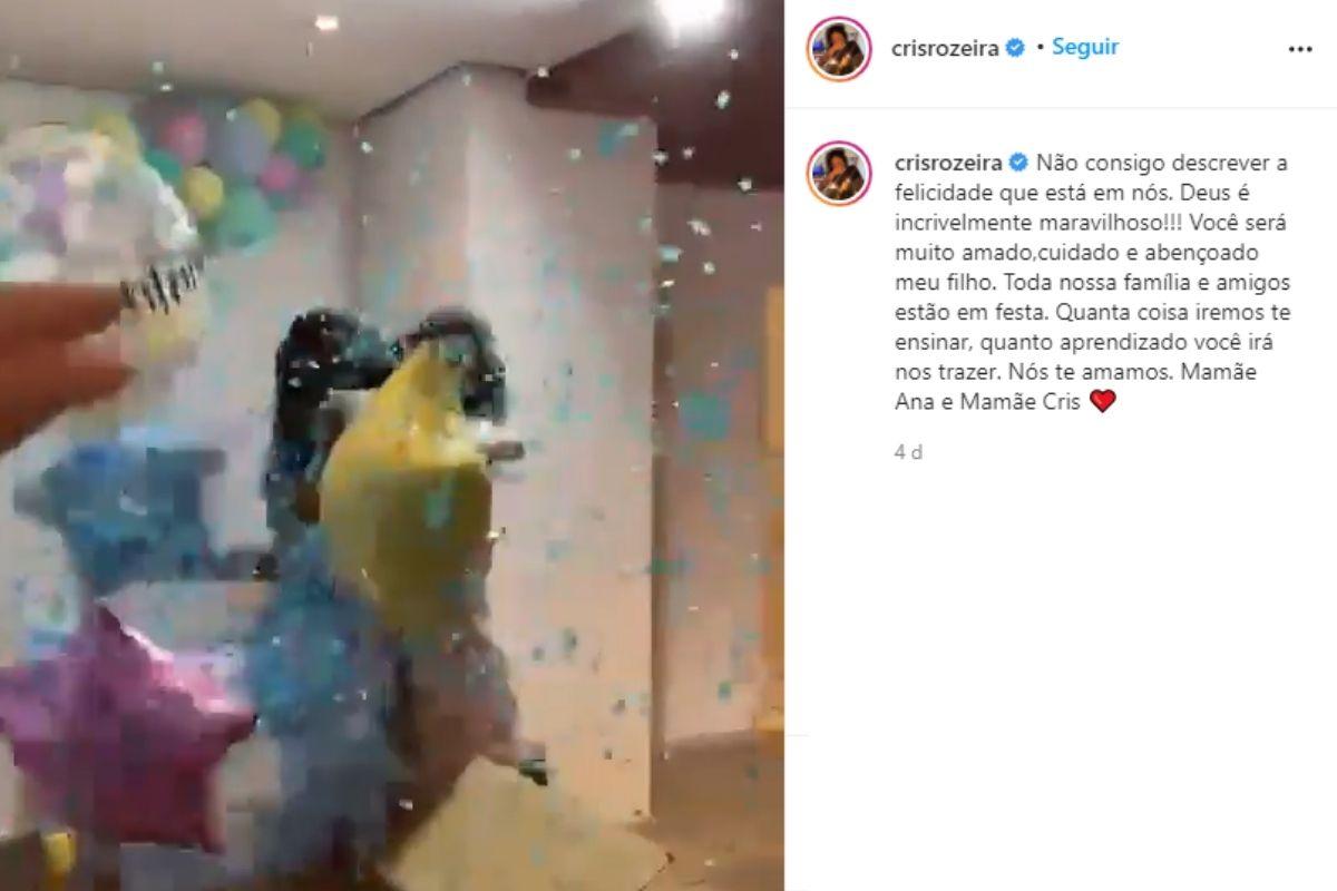 “Não consigo descrever a felicidade que está em nós. Deus é incrivelmente maravilhoso!!! Você será muito amado, cuidado e abençoado meu filho. Toda nossa família e amigos estão em festa“, escreveu a atleta na publicação. Nas imagens, é possível ver o balão estourando e saindo confete azul de dentro. “Quanta coisa iremos te ensinar, quanto aprendizado você irá nos trazer. Nós te amamos. Mamãe Ana e Mamãe Cris”, disse ela.