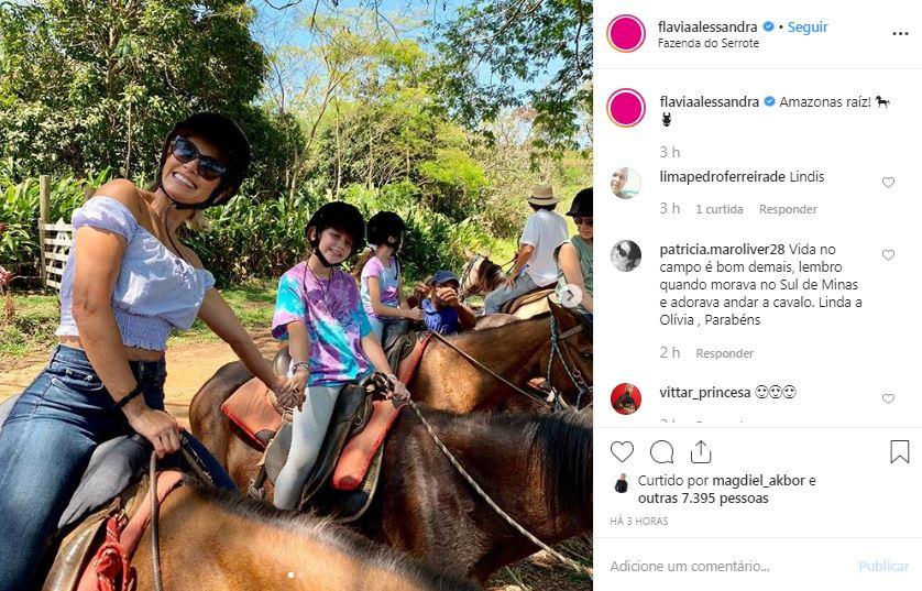 No Instagram, a atriz publicou fotos ao lado da menina de 9 anos, fruto de seu relacionamento com o ator e apresentador Otaviano Costa, mostrando que levou a filha para andar à cavalo. “Amazonas raiz!”, declarou Flávia Alessandra na legenda da publicação.