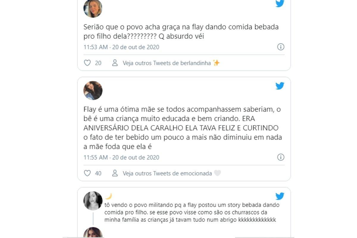 Após a  polêmica os fãs da ex-BBB saíram em defesa da cantora. “Mas esse povo já procura algo pra falar mal dos outros né? Se a Flay deixasse o Bê com fome, sem nada para beber, o povo iria reclamar. Agora, se está alimentando o menino, reclamam também”, rebateu uma seguidora. “Flay é uma ótima mãe se todos acompanhassem saberiam, o bê (Bernardo) é uma criança muito educada e bem criando. Era aniversário dela e ela estava feliz e curtindo o fato de ter bebido um pouco a mais não diminuiu em nada a mãe que ela é”, rebateu outa.  Confira as imagens: