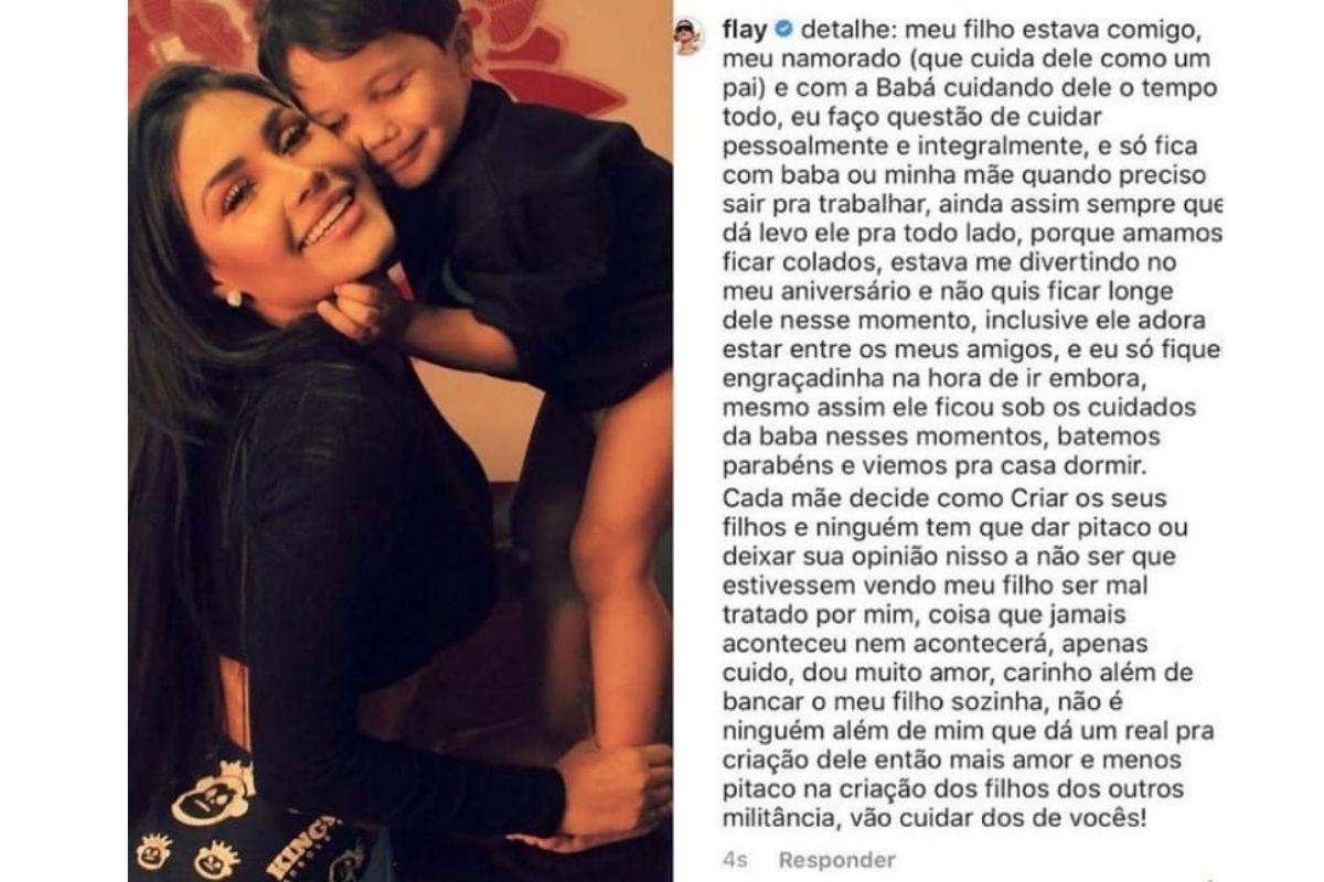 A cantora cutucou aqueles que fizeram críticas à família e afirmou que “cada mãe decide como criar os seus filhos”, acrescentando que “ninguém tem que dar pitaco ou deixar sua opinião nisso”. Flay também disse que nunca maltratou a criança e que isso “nem acontecerá’.