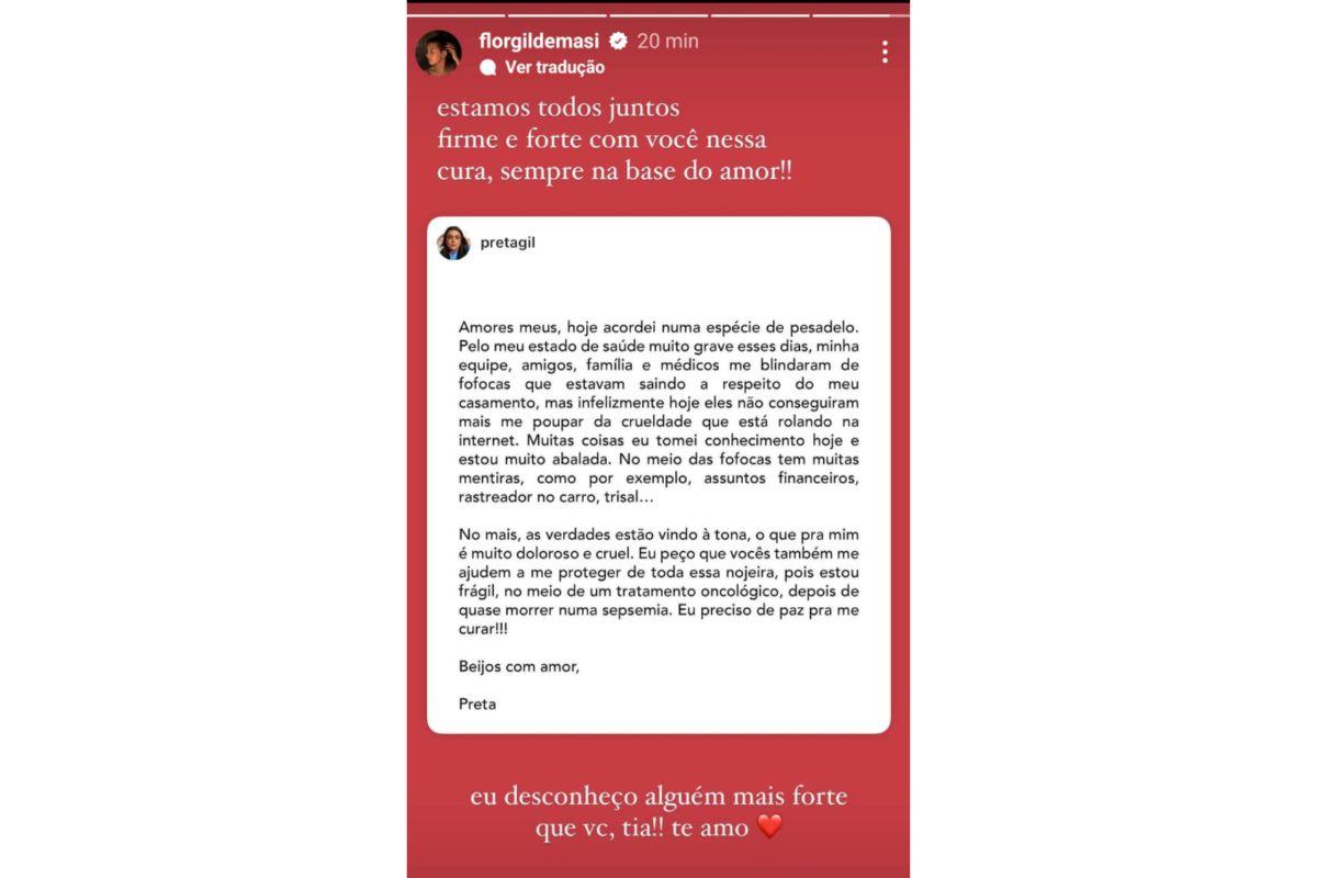 Nesta quarta-feira, 19 de abril, apenas um dia após virem à tona diversas notícias sobre o fim do casamento da cantora Preta Gil, a sobrinha, Flor Gil, de 14 anos, publicou uma mensagem de apoio nas redes sociais. Ela republicou o texto da tia, em que falava sobre os comentários que tem visto acerca da separação, e disse que a família toda está por perto para apoiá-la.