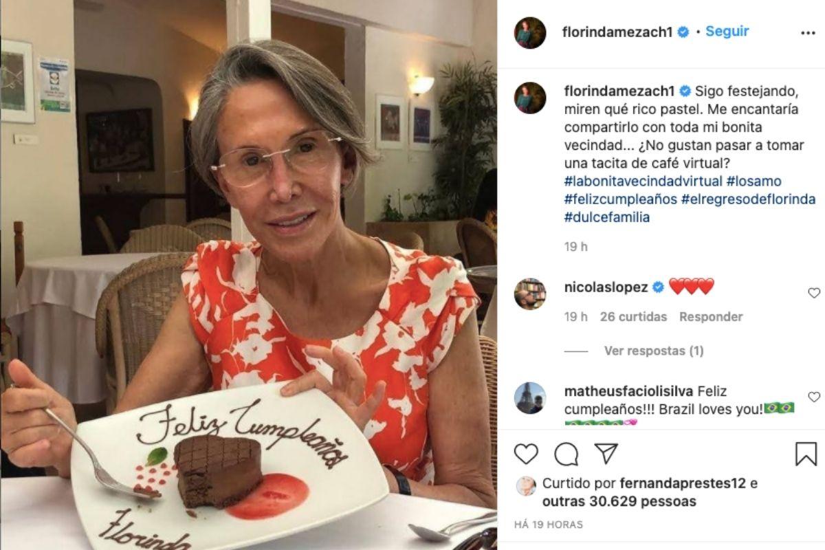 “Sigo festejando e olha que bolo delicioso. Eu adoraria compartilhar com toda a minha linda vizinhança… Você não gostaria de entrar para tomar uma xícara de café virtual?”, brincou ela, adaptando pros tempos de pandemia o famoso bordão que dizia ao namorado, professor Girafales, interpretado por Rubén Aguirre, no programa.