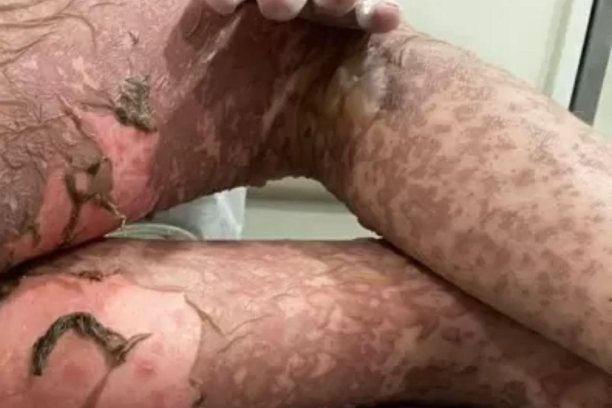 Ela também disse que começaram a aparecer bolhas d´água por todo corpo do filho, como se ele tivesse sofrido com queimaduras. A pele do garoto começou a se soltar, porque na verdade, ele teve uma reação cutânea adversa a medicamentos. Essa reação se chama farmacodermia.