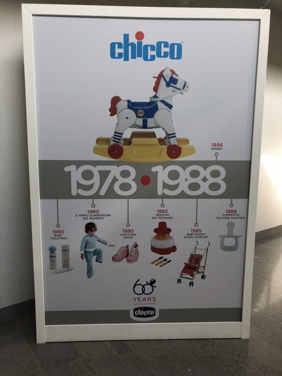 E lá fomos nós para a Itália. O lugar onde nasceu a Chicco, uma das marcas de produtos para bebês e crianças mais conhecidas no mundo e que esse ano completa 60 anos. Durante o período, as mudanças e as criações são impressionantes, mas antes de qualquer coisa, vale você saber que a pronúncia é “Kiko” e não “Chico”. É normal confundir. Descobrimos que a marca nasceu após o fundador Pietro Catelli ser pai pela primeira vez. Nasceu o Enrico e a Chicco.