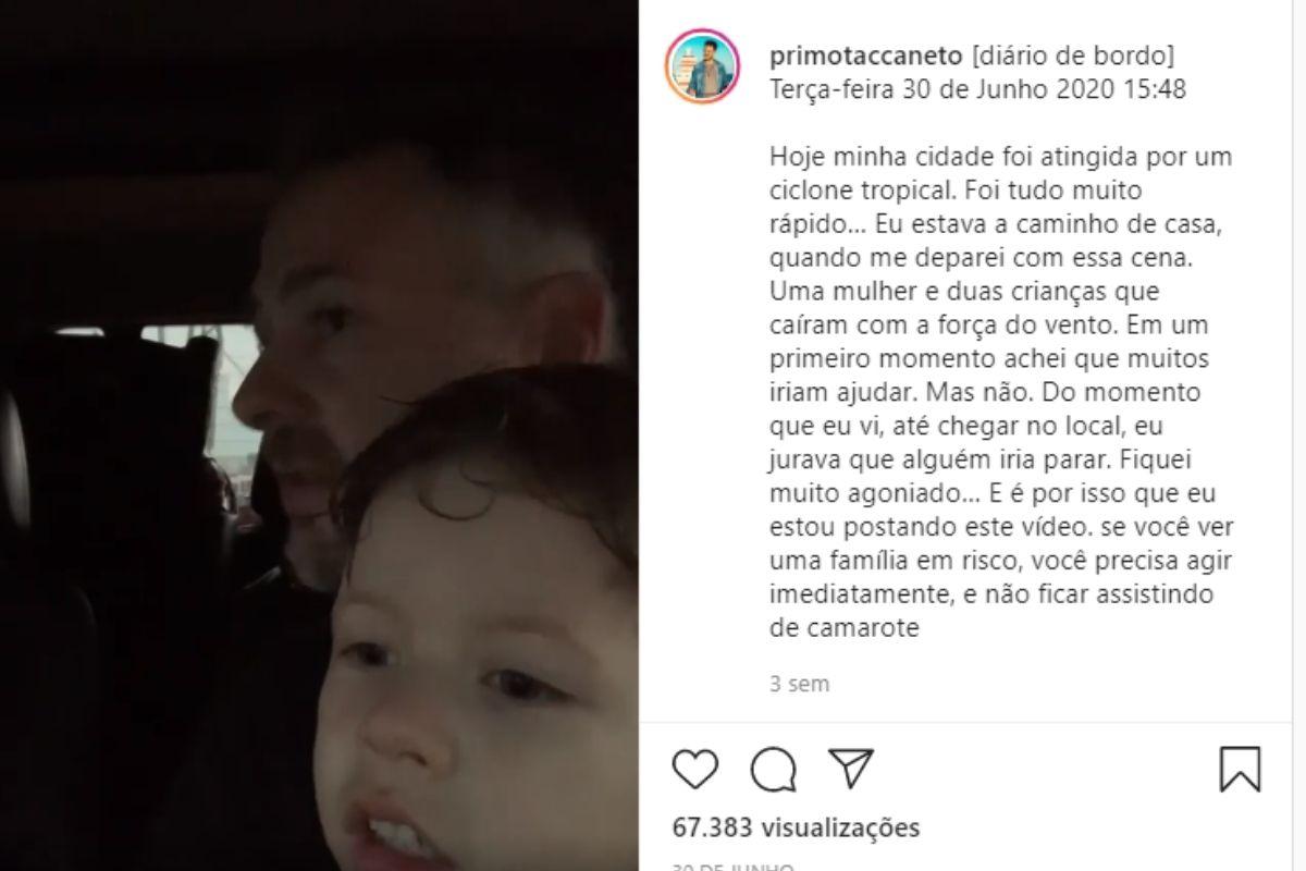 “Hoje minha cidade foi atingida por um ciclone tropical. Foi tudo muito rápido… Eu estava a caminho de casa, quando me deparei com essa cena. Uma mulher e duas crianças que caíram com a força do vento. Em um primeiro momento achei que muitos iriam ajudar. Mas não. Do momento que eu vi, até chegar no local, eu jurava que alguém iria parar. Fiquei muito agoniado… E é por isso que eu estou postando este vídeo. se você ver uma família em risco, você precisa agir imediatamente, e não ficar assistindo de camarote”, escreveu o fotógrafo no seu Instagram.