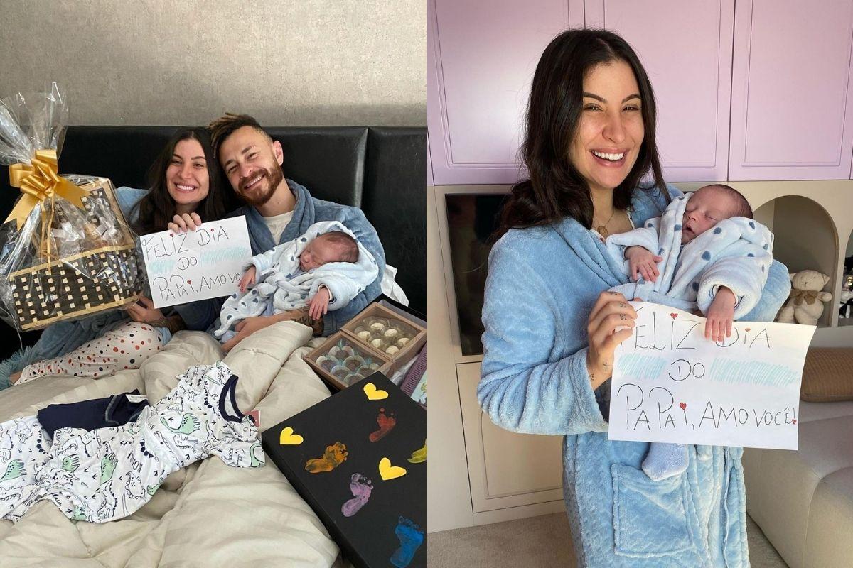 Bianca apareceu no quarto do casal com o filho no colo e junto de muitos presentes: uma cesta de café da manhã, um quadro preto com os pés de Cris em várias cores diferentes, uma caixa de brigadeiro e roupas. Um primeiro dia dos pais bem recheado.