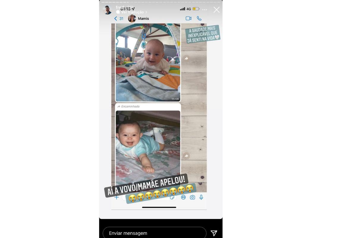 Sobre o filho, o influenciador não escondeu o sentimento que sentiu por estar longe do menino, atualmente com 4 meses de idade. Fred publicou um print de uma conversa com a mãe, a qual lhe enviou uma foto de Cris sorrindo para a câmera.