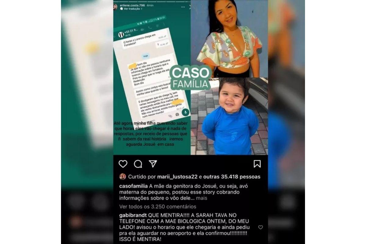 Nesta terça-feira, 14, a influenciadora Gabi Brandt defendeu sua cunhada, Sarah Poncio, em post feito pela página @casofamilia, onde a avó biológica de Josué culpava a família Poncio por não fornecer informações da chegada de Josué em Fortaleza, capital do Ceará, para a guarda compartilhada.