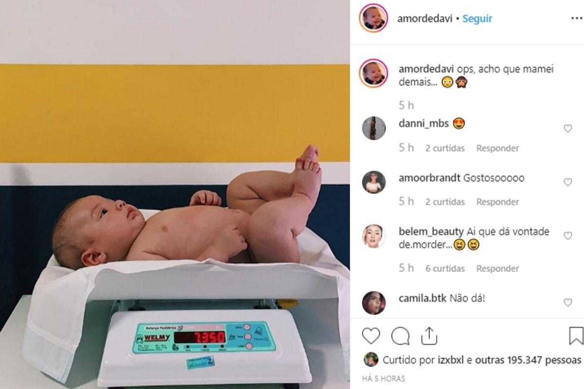 Davi aparece deitado numa balança infantil, a qual mostra que o bebê está pesando 7,350 kg. “Ops, acho que mamei demais”, escreveu Gabi em legenda.