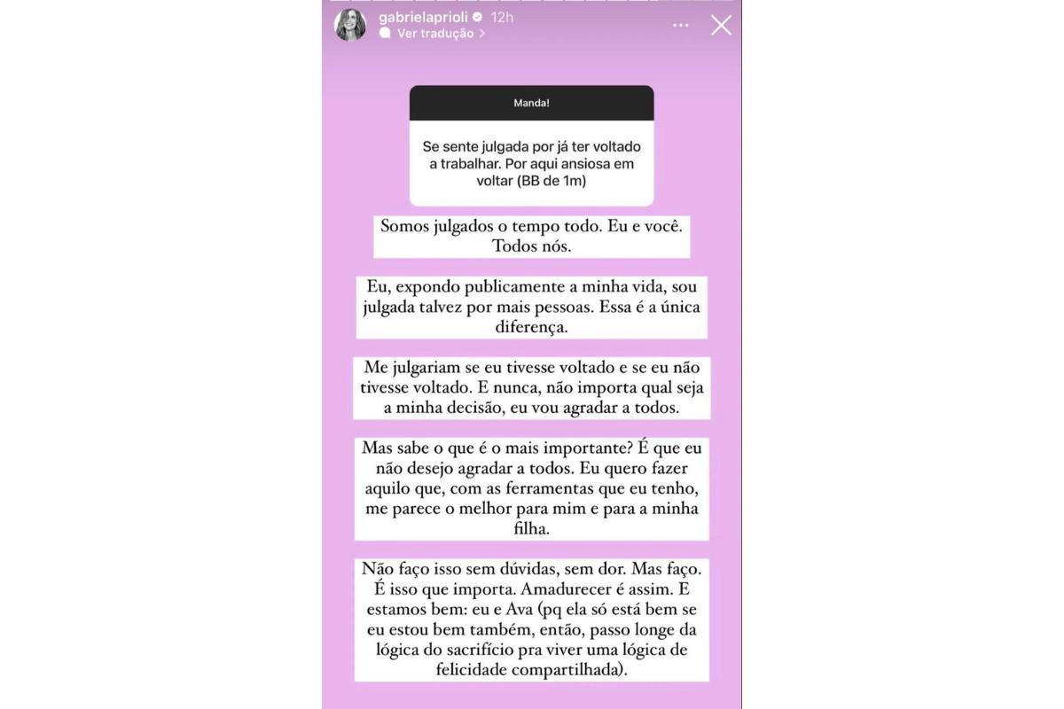 Ao responder algumas perguntas feitas pelos seguidores em suas redes sociais, Gabriela Prioli foi questionada sobre já ter voltado a trabalhar após o recente nascimento da primeira filha. A apresentadora deu à luz a Ava no final de dezembro, fruto do seu relacionamento com Thiago Mansur.