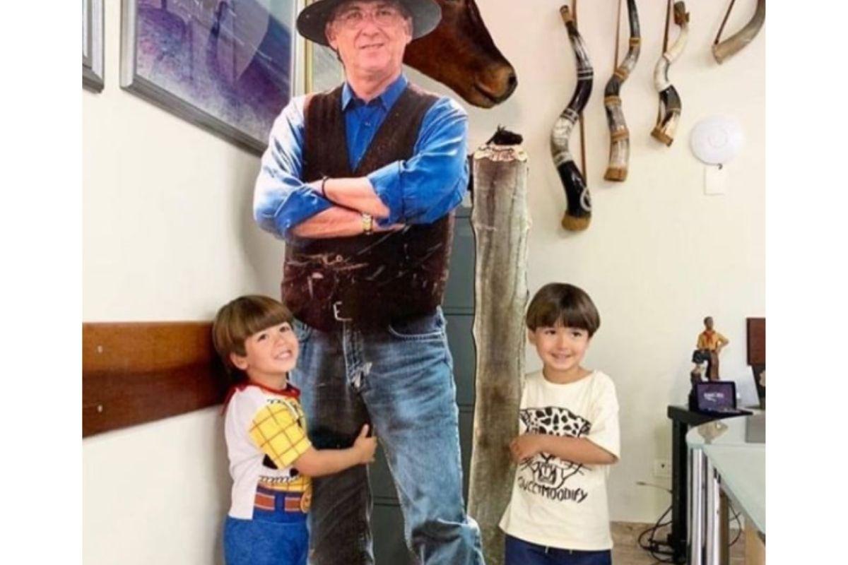 Galvão Bueno deu um jeito especial de comemorar o aniversário dos netos nesta terça-feira, 18 de agosto. O narrador postou uma foto onde Octávio e André, que completaram 4 anos, aparecem do lado de uma versão do avô feita de papelão!
