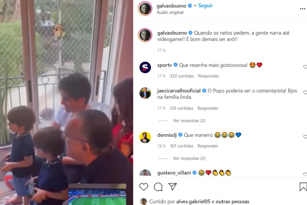 No último sábado, dia 13 de novembro, o narrador de esportes Galvão Bueno, de 71 anos de idade, compartilhou no Instagram um vídeo divertido ao lado dos netos pequenos.