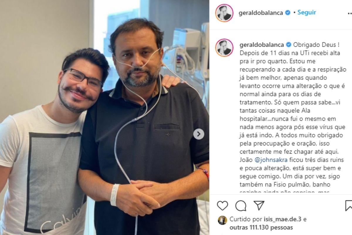 O apresentador Geraldo Luís teve motivos de sobra para comemorar nesta sexta-feira, 12 de março: ele recebeu alta da UTI após 11 dias internado com Covid-19. Nas redes sociais, o radialista publicou um texto agradecendo o apoio dos fãs e fotos dele no quarto do hospital, onde está acompanhado pelo filho, João.