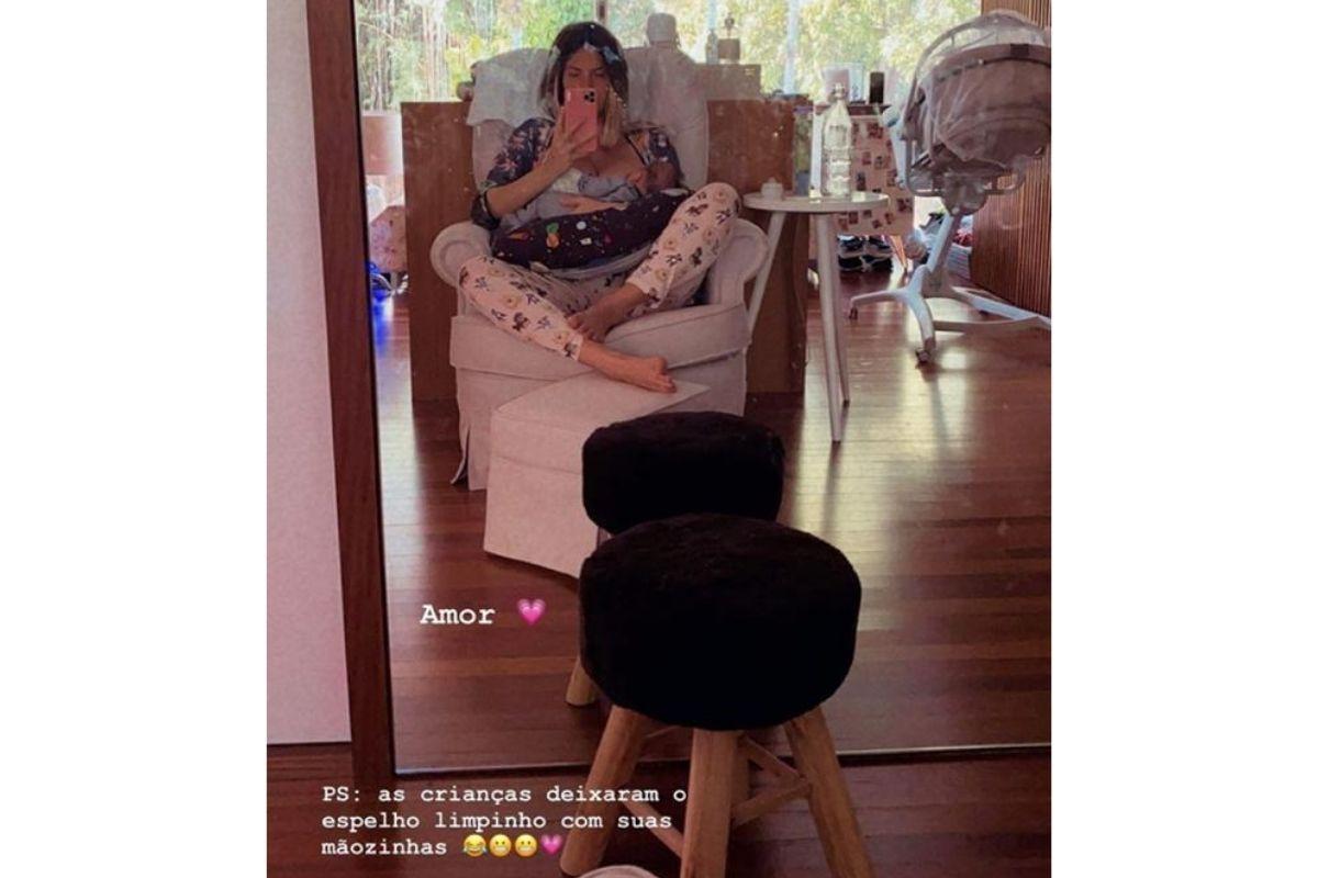 A apresentadora Giovanna Ewbank usou as redes sociais para compartilhar um momento super especial: a amamentação. A famosa publicou uma foto em que aparece em frente a um espelho, amamentando Zyan. Junto coma a imagem, Giovanna comentou sobre a limpeza do móvel e fez uma brincadeira com Titi e Bless. “Amor. PS: as crianças deixaram o espelho limpinho com suas mãozinhas”, escreveu junto à imagem.