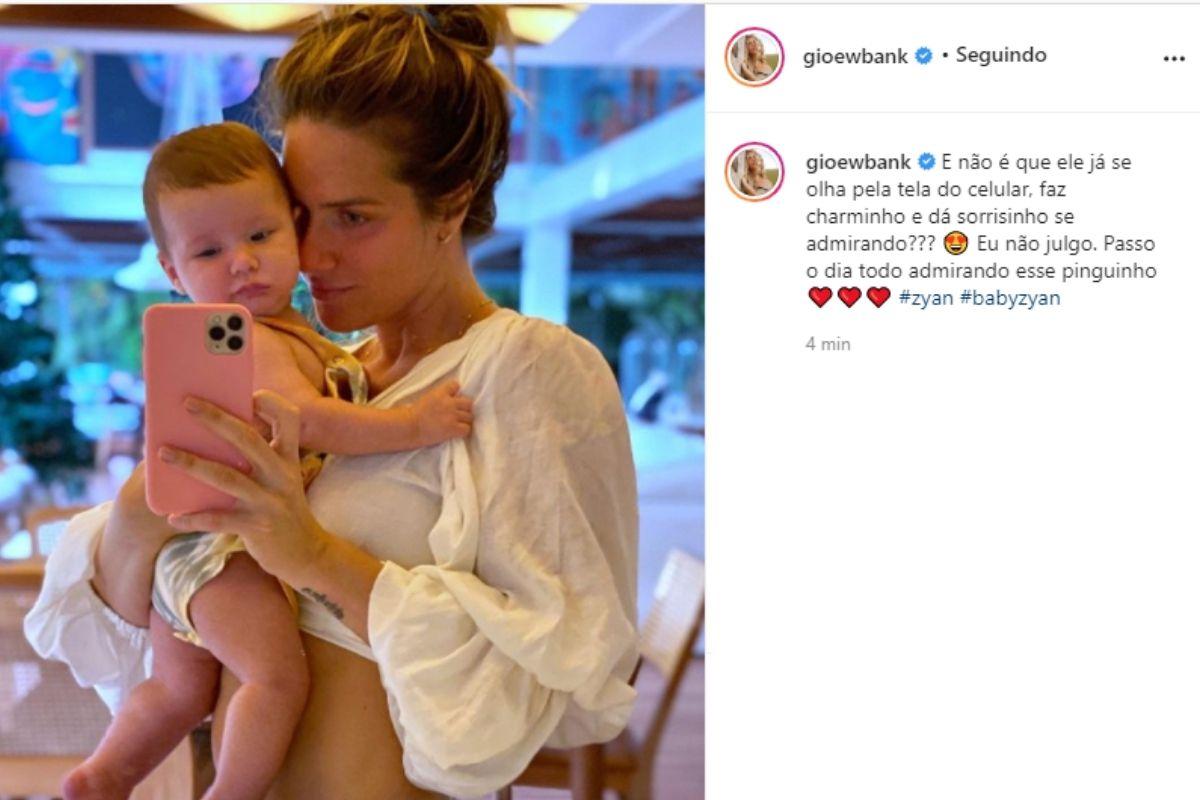 Na foto, Giovanna aparece segurando o filho enquanto posa com o celular na mão de frente para um espelho. Na legenda, a artista brincou sobre a expressão de Zyan na imagem: “E não é que ele já se olha pela tela do celular, faz charminho e dá sorrisinho se admirando?”.