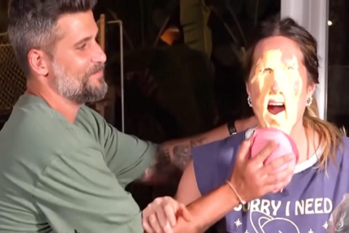 Após a primeira rodada, Giovanna e Bless perderam. Bruno, então, decidiu dar a torta na cara da esposa. “Um a zero para os meninos”, comemorou o ator. Ao fim da disputa, Bruno brincou: “É isso, gente. Então já sabem. Não casem com uma mulher que tem um canal no YouTube porque acontece isso”.