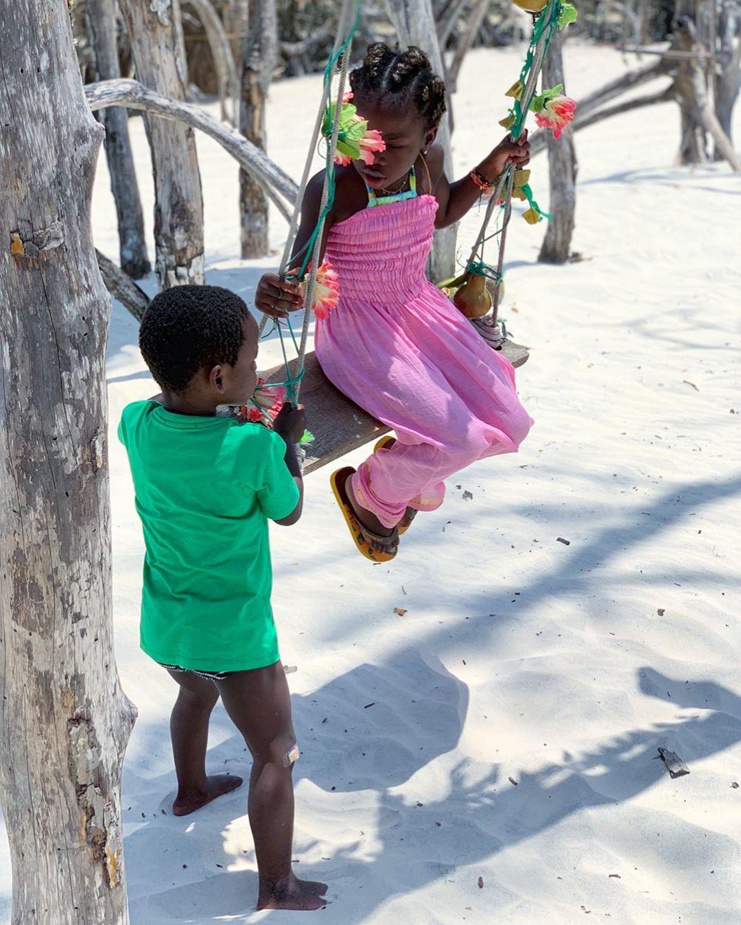 Em comemoração ao Dia das Crianças, Giovanna Ewbank compartilhou um lindo registro dos filhos Titi, de 6 anos, e Bless, de 4 anos. Juntos, os irmãos aparecem brincando em um balanço de praia, com sol e areia ao fundo.