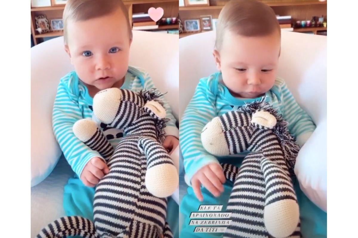 Giovanna Ewbank também já mostrou aos internautas qual é o brinquedo favorido de Zyan: um boneco de zebra que era da Titi! “A zebrinha que era da Titi que agora é a predileta dele”, falou ela ao mostrar o bebê brincando com o boneco. “A Titi deu pra vc filho?”, perguntou em seguida. Nas imagens, Zyan fica olhando e mexendo com o boneco.