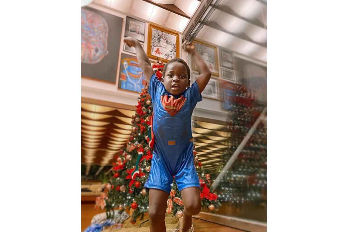 Em frente à arvore de Natal e fantasiado como super-heróis, Bless foi fotografado pelo pai fazendo poses. Na legenda, Bruno escreveu: “Voa, SUPER-HOMEM, voa!”.