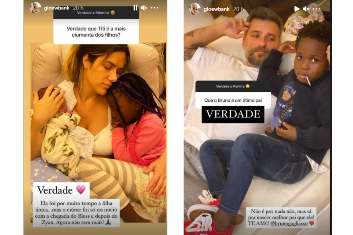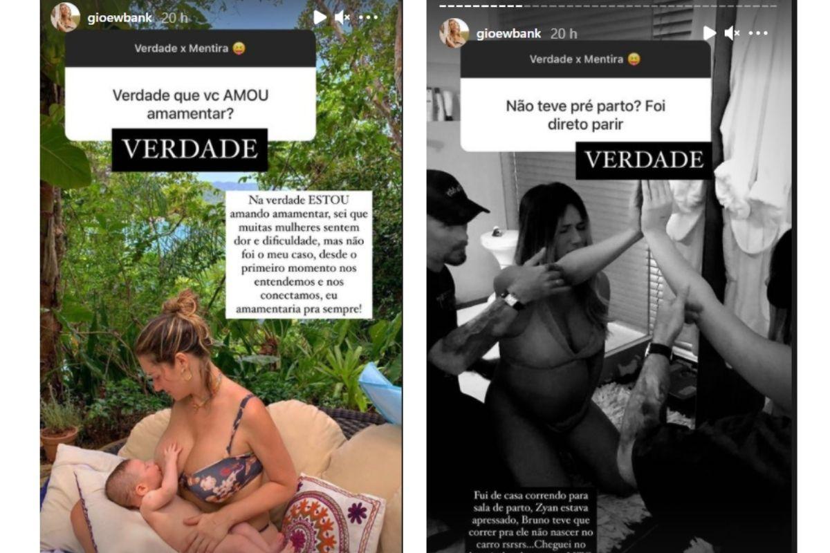 Começando pela gestação de Zyan, Giovanna confirmou para os internautas que praticamente não teve trabalho de parto, contando que Bruno Gagliasso precisou se virar para o bebê não nascer no carro. “Foi muito rápido e prazeroso, queria viver tudo novamente”, completou a mãe em outro storie.