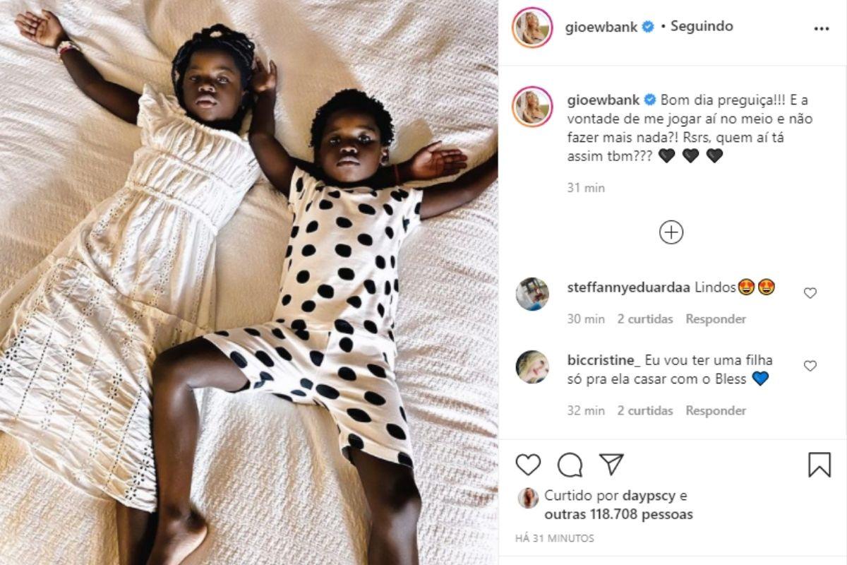 Na manhã da última quinta-feira, 03 de dezembro, Giovanna Ewbank usou o Instagram para compartilhar um momento de preguiça dos filhos Titi e Bless, de sete e cinco anos. Nas imagens, a apresentadora, se derreteu pelos filhos. Além dos dois, ela também é mãe de Zyan, de quatro meses, todos frutos do relacionamento com Bruno Gagliasso.