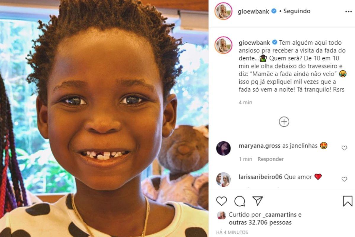 Nesta última terça-feira, 29 de setembro, Giovanna Ewbank mostrou como o Bless, de 5 anos, está ansioso para receber a visita da fada do dente. A apresentadora usou o Instagram para compartilhar uma foto do filho em que ele aparece sorridente com o dente faltando.