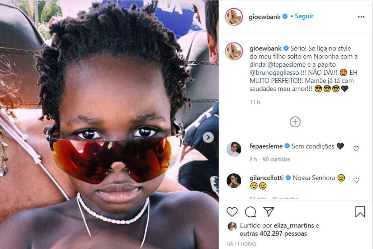 Na legenda, a apresentadora se derreteu pelo filho. “Sério! Se liga no style do meu filho solto em Noronha com a ‘dinda’ e o ‘papito’! Não dá! É muito perfeito! Mamãe já está com saudades meu amor”, escreveu Giovanna. Diante da imagem, os internautas não dispensaram os elogios para o menino. “Ele é maravilhoso! Não dá com o Bless“, concordou uma das seguidoras. “A perfeição em forma de criança”, destacou outra.