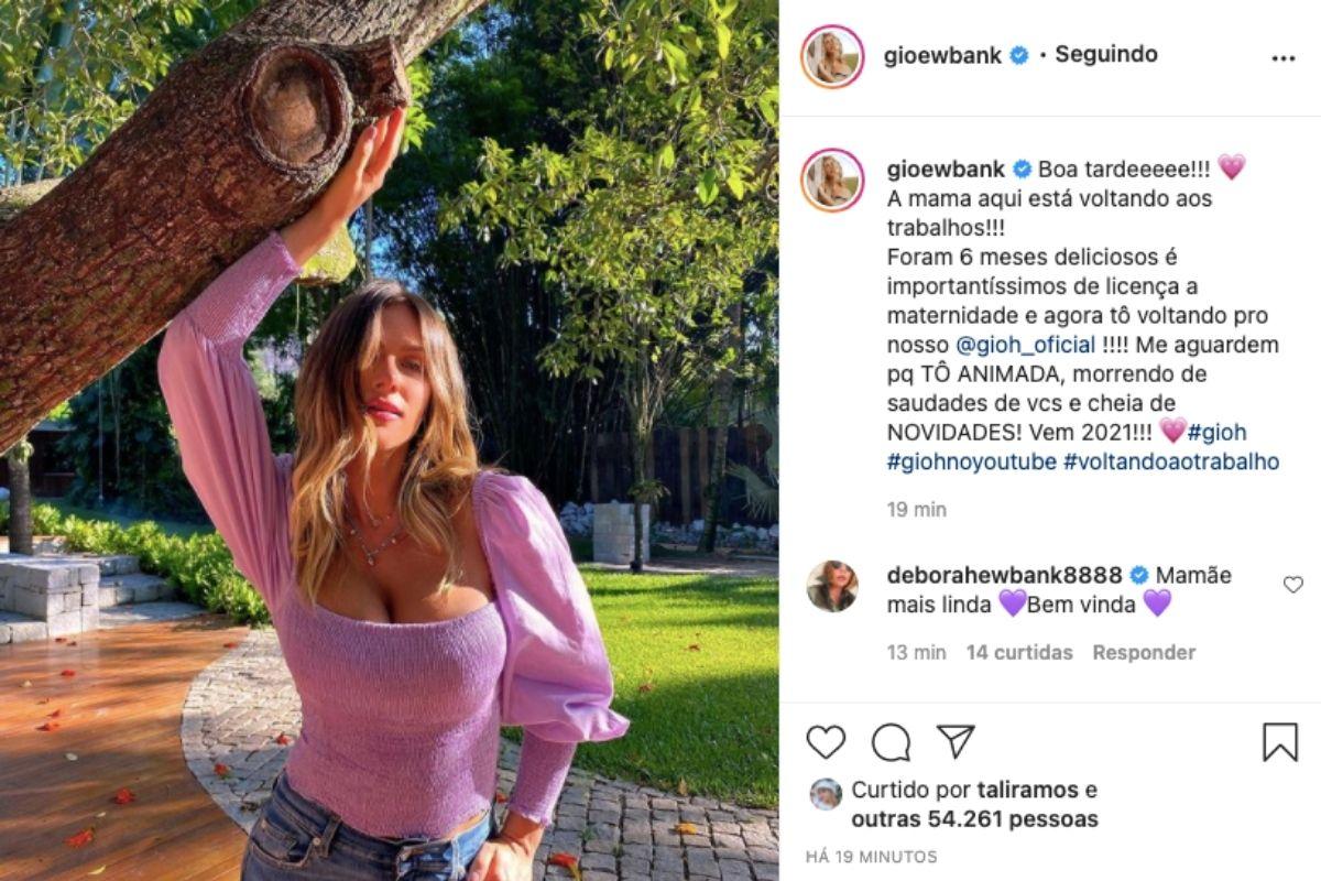 “A mama aqui está voltando aos trabalhos! Foram seis meses deliciosos e importantíssimos de licença-maternidade e agora estou voltando para nosso @gioh_oficial!”, disse ela, se referindo ao seu canal no YouTube. “Me aguardem porque estou animada, morrendo de saudades de vocêse cheia de novidades! Vem 2021”, escreveu ela na legenda da publicação.