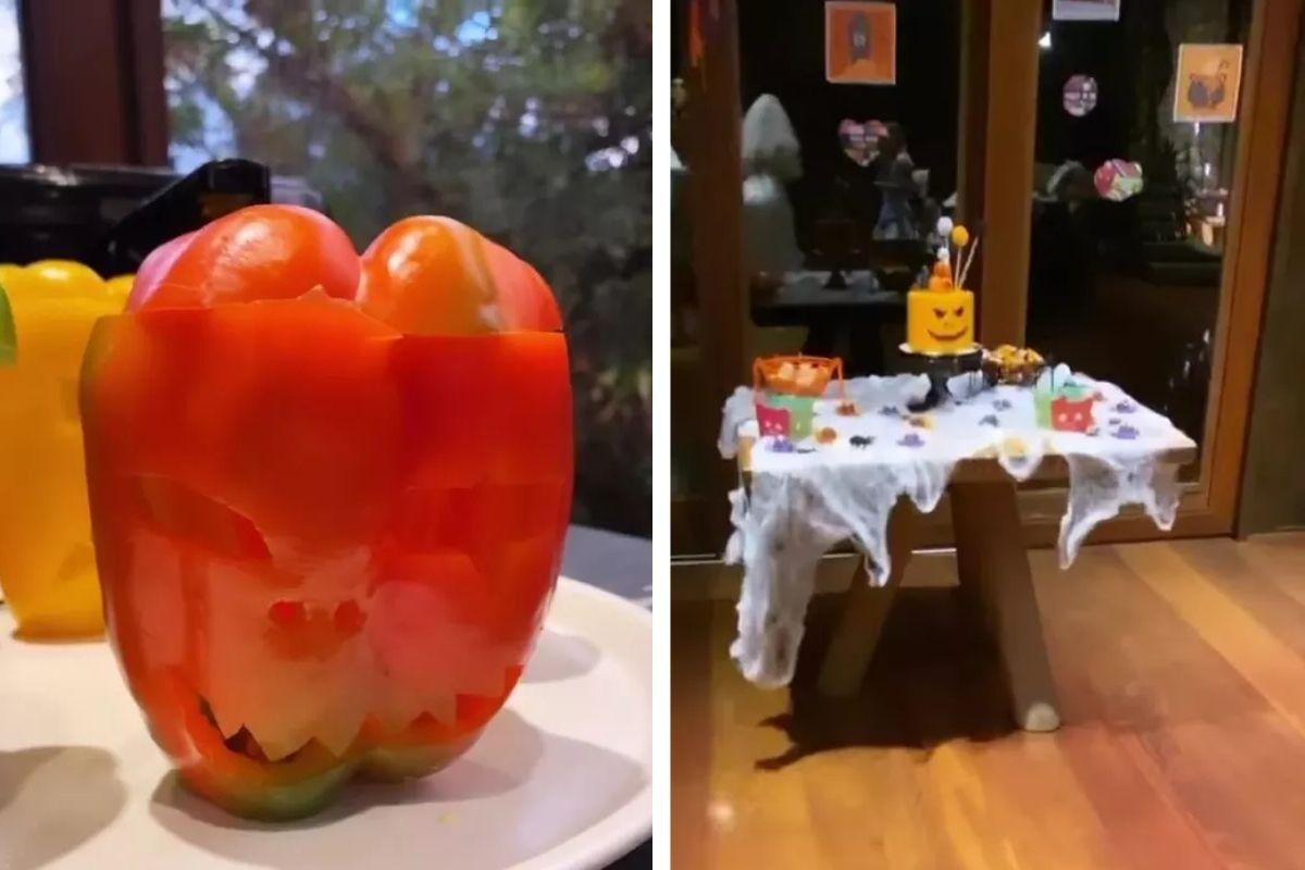 Além de espalhar doce pela casa, a decoração foi criativa e de arrepiar! Foram colocados sobre a mesa pimentões coloridos para representar cabeças de Frankenstein. A família também abóbora e muitas aranhas e morcegos, clássicos do Halloween.