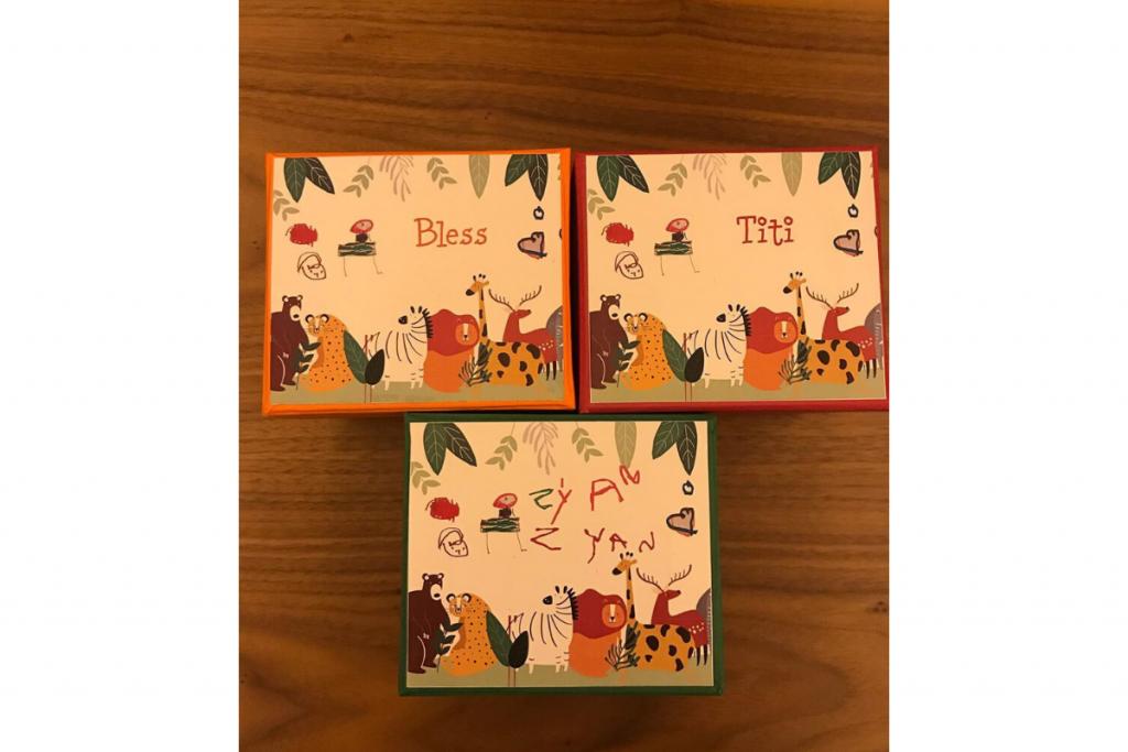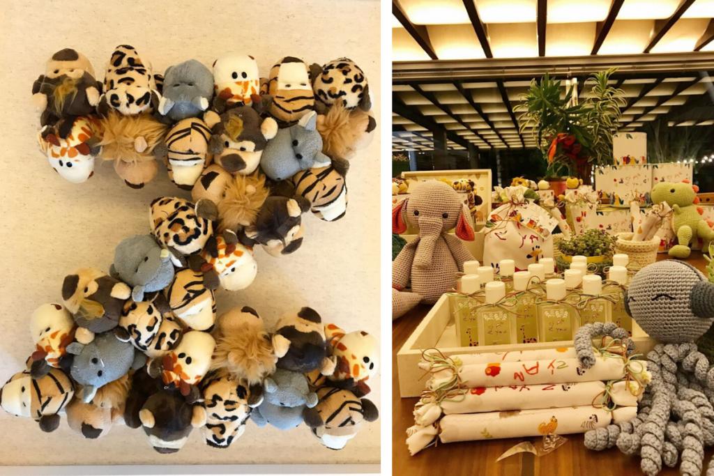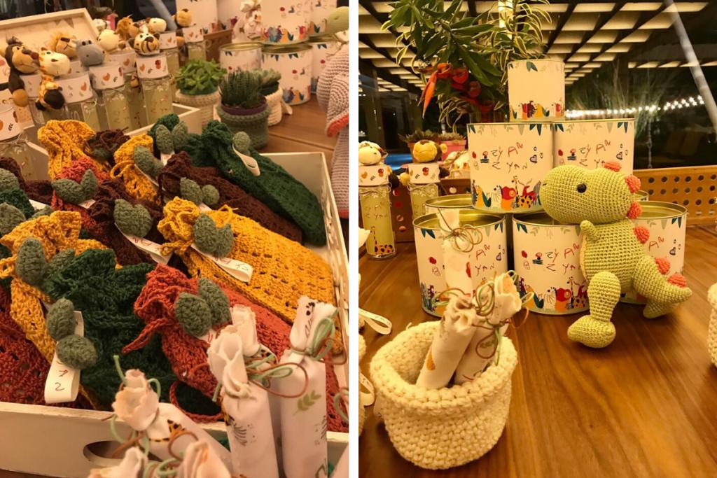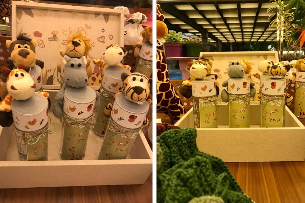 O tema escolhido foi animais e tons terrosos tomaram conta. Todos os presentes estão em um kit feito de crochê. Nele, os pais escolheram diversas coisas. Bem-casados, balas, álcool em gel, águas e caderninhos. As pessoas ainda recebem recados escritos por Titi e Bless, que também são filhos do casal.