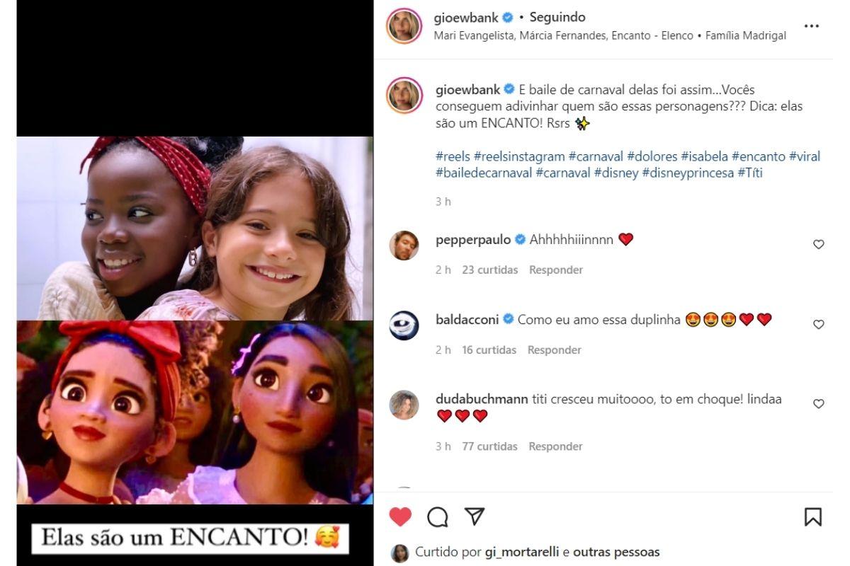 No post compartilhado, a primogênita está com uma amiga que também foi vestida a caráter. Os trajes das meninas foram inspirados nas personagens Isabela e Dolores, do filme Encanto.