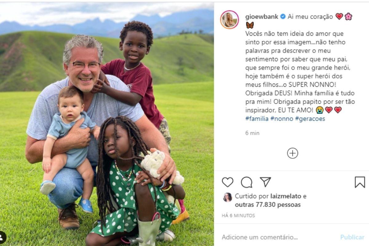 A apresentadora Giovanna Ewbank usou as redes sociais para compartilhar uma foto cheia de amor dos filhos, Titi, Bless e Zyan, ao lado do avô, Roberto Baldacconi, pai de Giovanna. Junto com a imagem, a famosa aproveitou a publicação para fazer uma verdadeira declaração para o pai sobre o amor presente entre a família.