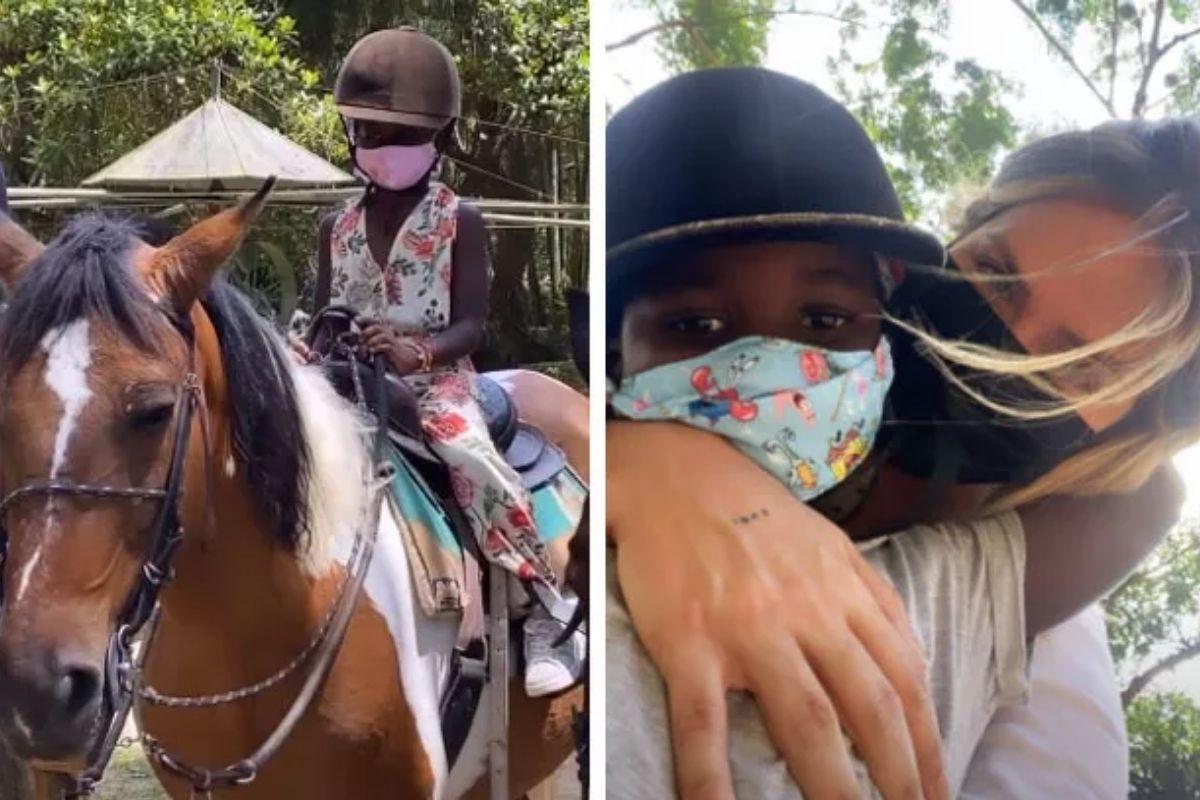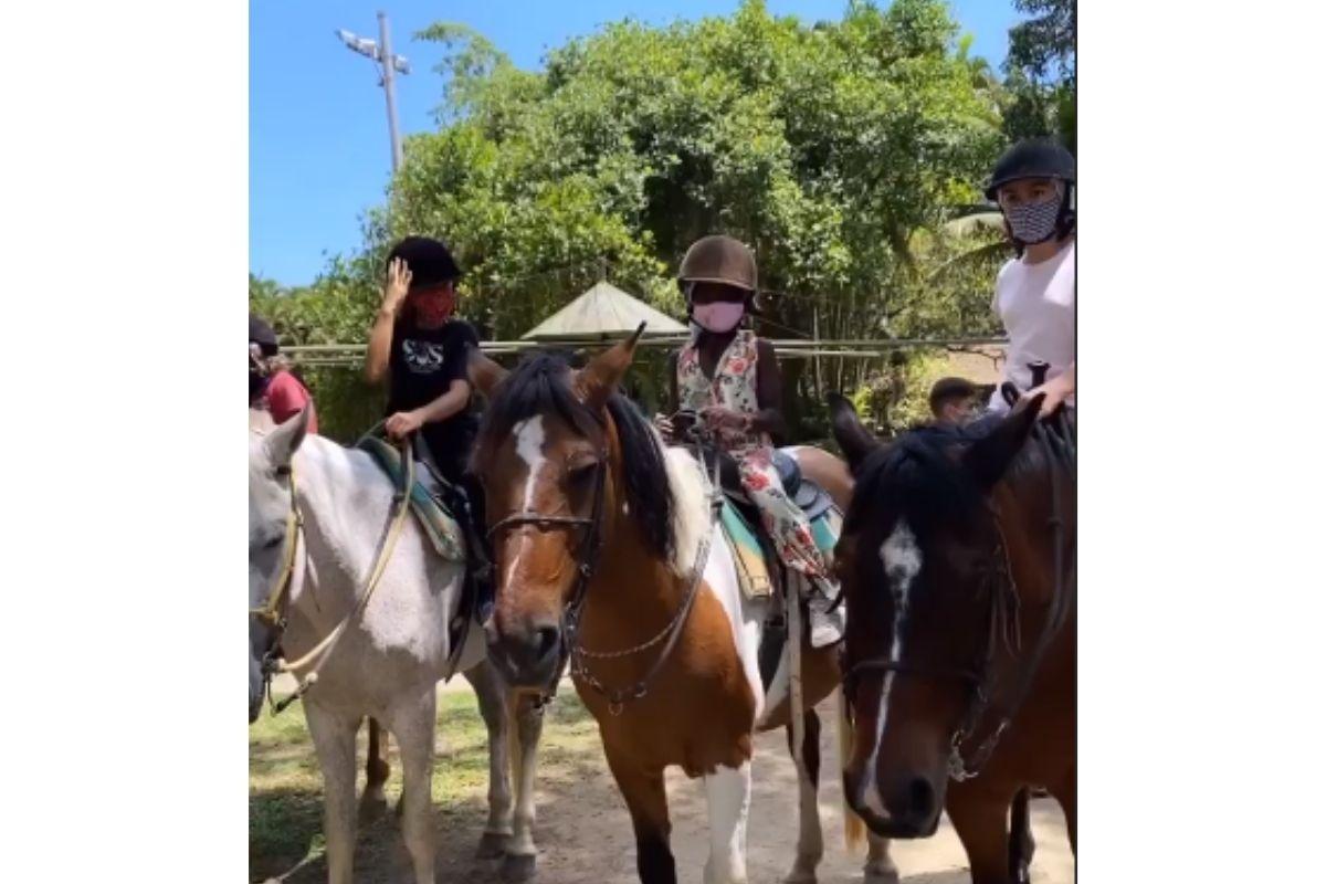 Titi apareceu animada em cima do animal, usando uma roupa florida ao lado de Bless. Quando questionada por Giovanna sobre qual era o nome do cavalo, a criança respondeu que era “Toddy”.“Que lindo”, se derreteu a mãe, enquanto fazia carinho no animal.