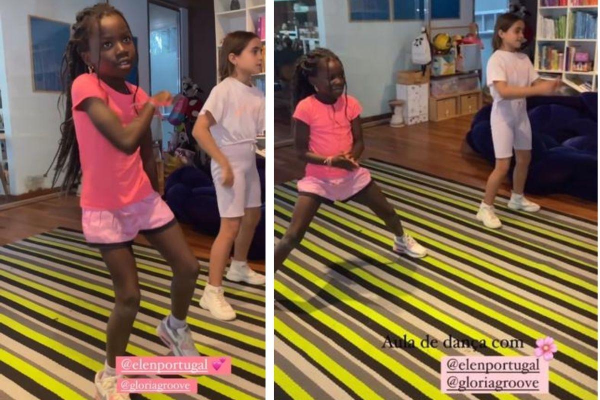 No vídeo, Titi, que tem 8 anos, apareceu tendo uma aula de dança do TikTok com dançarina e criadora de conteúdo Elen Portugal. Junto com ela, Francisca, filha de Rodrigo e Francisca Pereira, também se jogou na dança! “Hoje as meninas estão tendo aula de TikTok com a Elen e olha Gloria [Groove] escolheram sua música, hein?”, escreveu Giovanna Ewbank ao mostrar o momento.