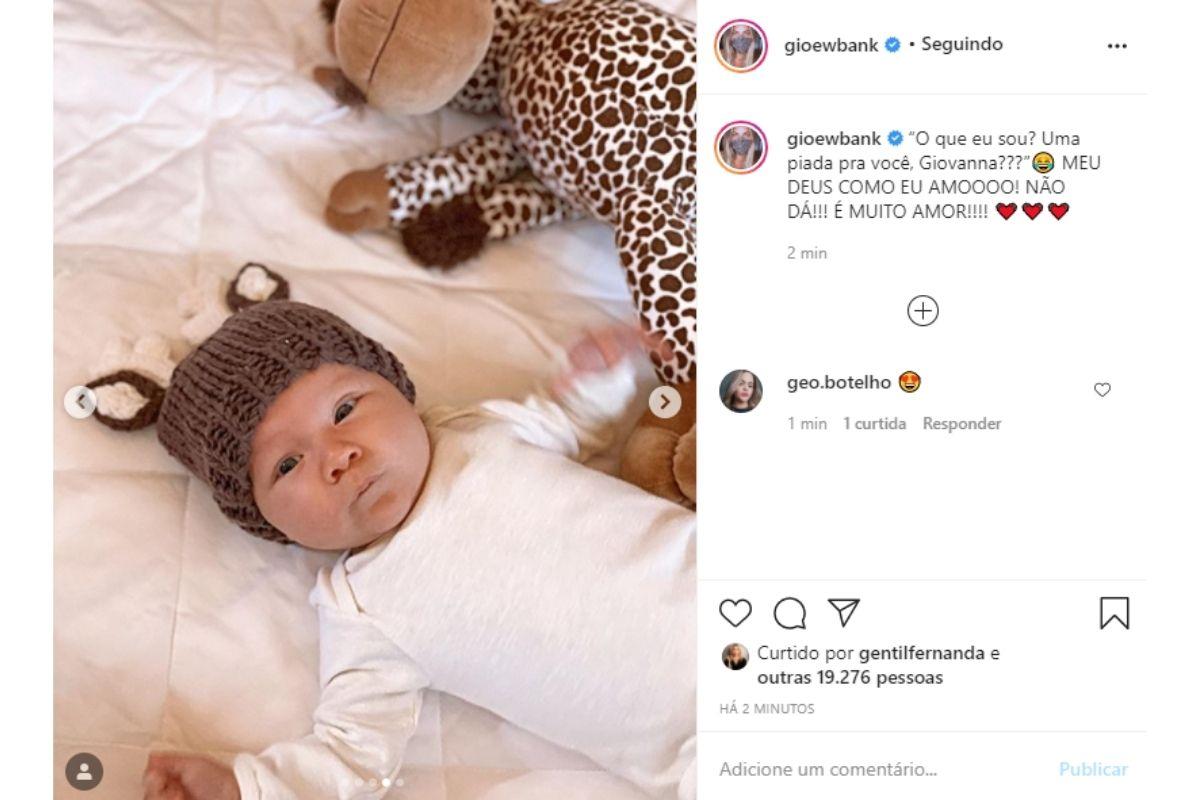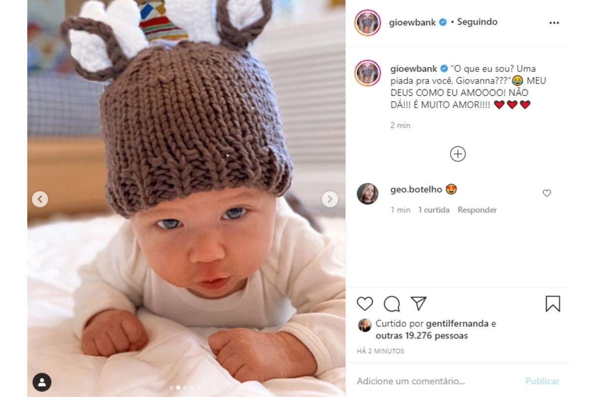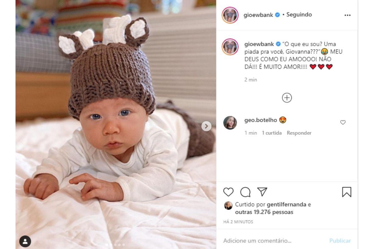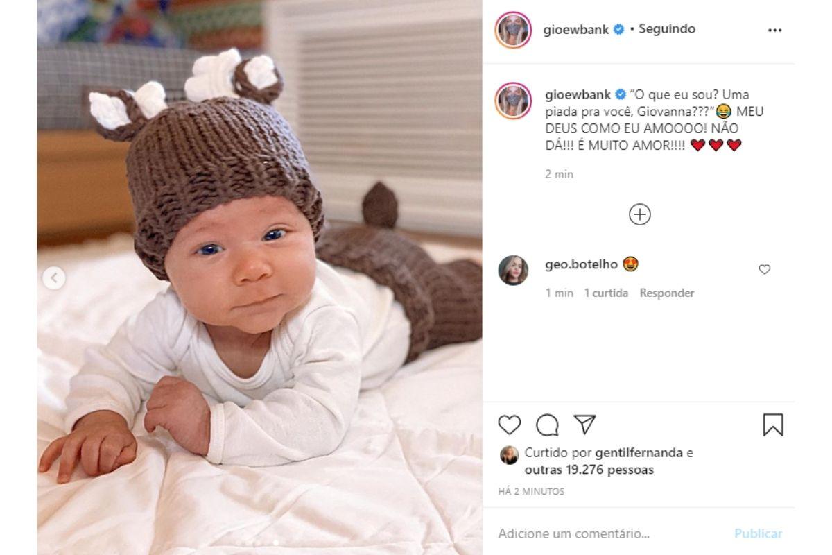 Na sequência de imagens, o caçula aparece na cama deitado de bruços, fantasiado de girafa. “O que eu sou? Uma piada pra você, Giovanna???”😂 MEU DEUS COMO EU AMOOOO! NÃO DÁ!!! É MUITO AMOR!!!!”, escreveu Giovanna na legenda. A apresentadora ainda brincou nos comentários sobre ser uma mãe babona. “Virei o que mais temia: a mãe que fantasia o filho pra fazer fotos”, disse.