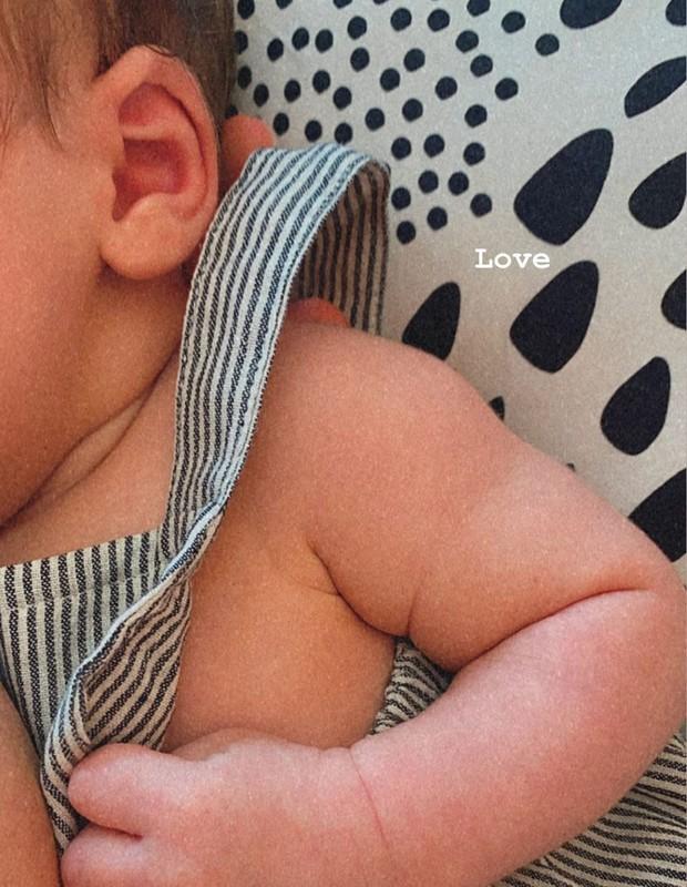 Na imagem, não é possível ver o rostinho do bebê, apenas seu braço e sua orelha. “Love [‘amor’, em inglês]”, escreveu a atriz na legenda da foto.