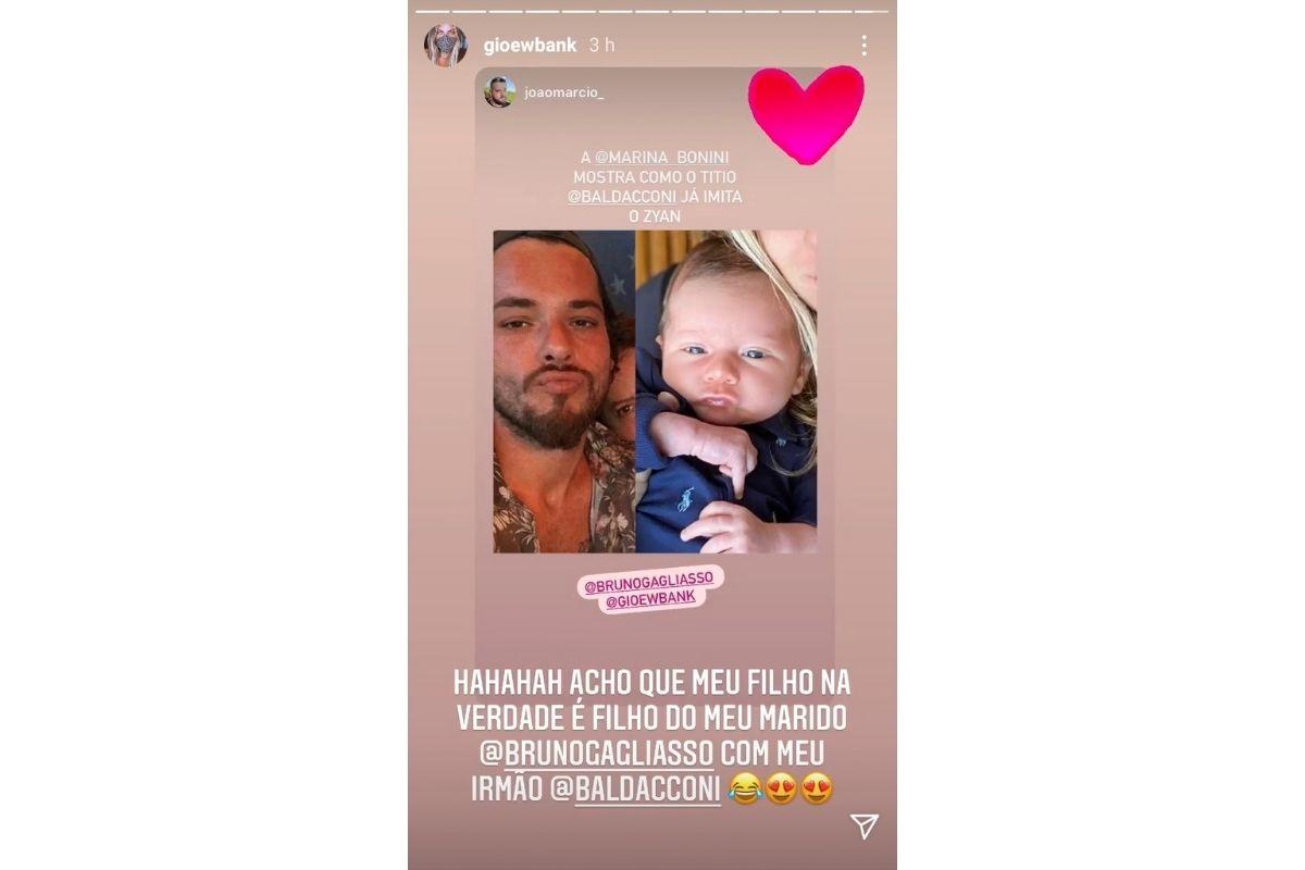 Ao repostar a montagem nos stories, ela brincou com a situação: “Acho que o meu filho na verdade é filho do meu marido com o meu irmão“. Na colagem, realizada por uma repórter da Quem, Giovanna comentou ao site que ficou assustada com a semelhança: “É chocante de igual. Já mandei para a família toda. Amei”.