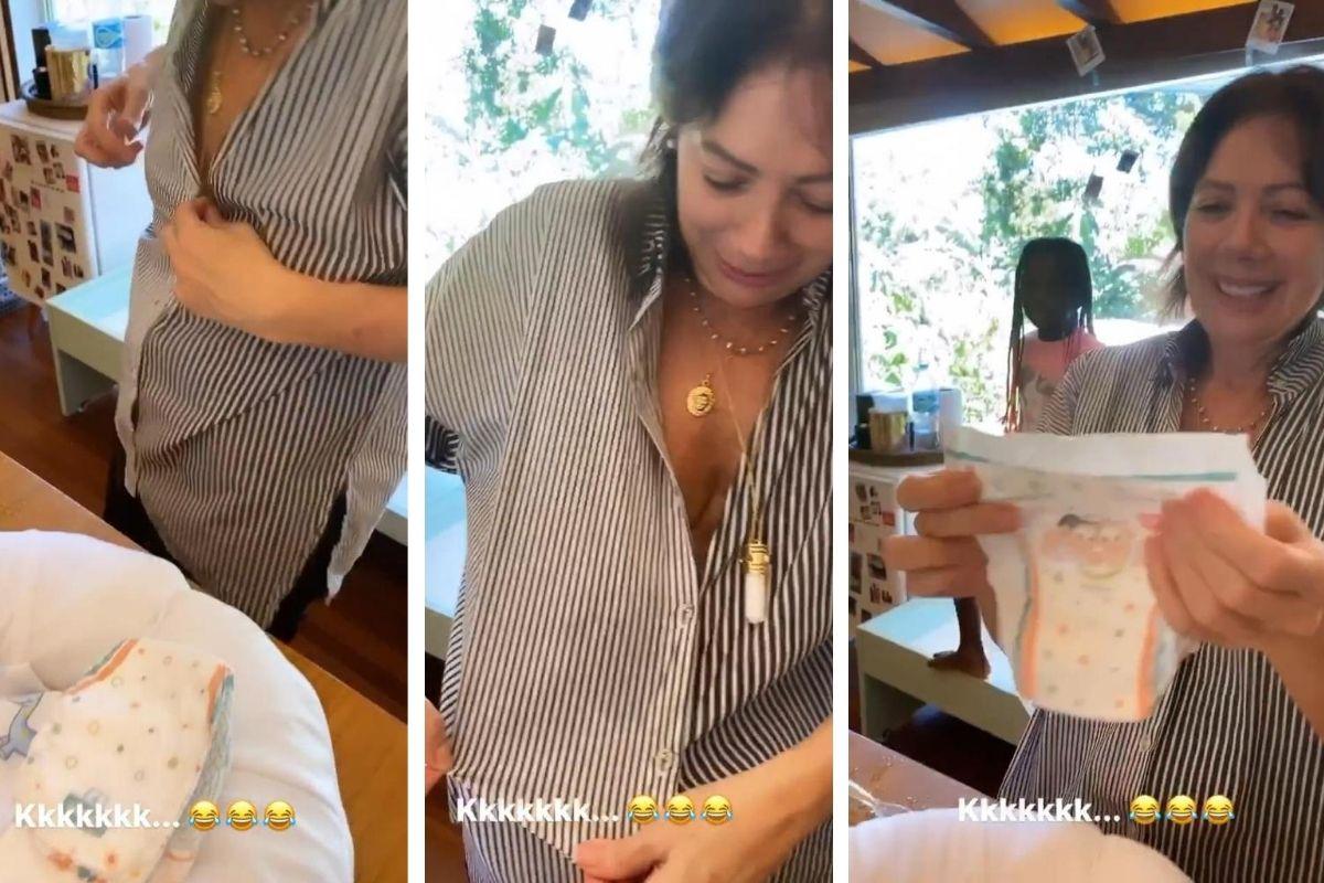 Nesta terça-feira, 11 de agosto, Giovanna Ewbank não conteve a risada ao mostrar a mãe, Débora Ewbank, com a camisa molhada de xixi ao trocar a fralda de Zyan. O menino é caçula da apresentadora com Bruno Gagliasso, com quem tem Títi, 7 anos, e Bless, 6 anos.