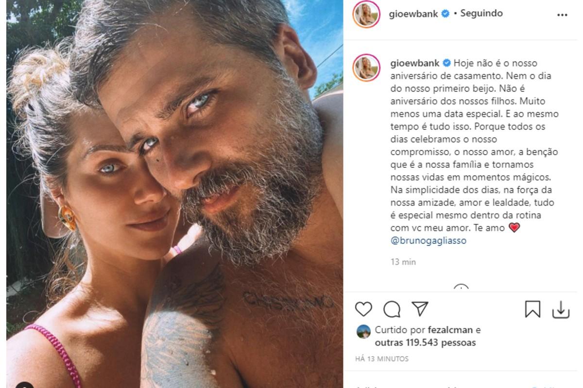 Giovanna Ewbank aproveitou esta quinta-feira (07) para fazer mais uma declaração para o marido, Bruno Gagliasso. Junto do texto, ela compartilhou uma foto do casal, que é pai de Titi, Bless e Zyan.