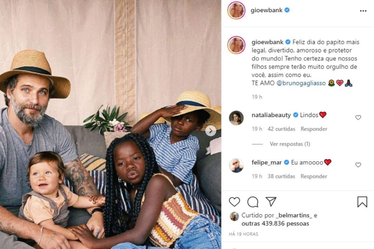Giovanna Ewbank usou as redes sociais no último domingo, 8 de agosto, para comemorar o Dia dos Pais com uma declaração super especial para o marido, Bruno Gagliasso. Para fazer a homenagem, a apresentadora compartilhou uma foto do marido junto com os filhos do casal, Titi, Bless e Zyan.