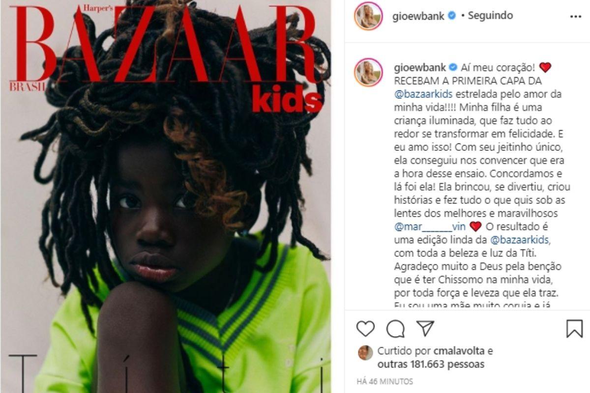 Giovanna Ewbank, na noite da última segunda-feira, 9 de novembro, compartilhou vídeo da reação cheia de fofura de Titi ao ser ‘tietada’ pela mãe após sair na capa da revista ‘Harper’s Bazaar Kids’ de novembro. Segundo a revista Quem, A menina, de 7 anos de idade, roubou a cena no ensaio fotográfico e deu outro show dentro de casa. A apresentadora é casada com Bruno Gagliasso, e além da Titi o casal tem outros dois filhos, Bless e Zyan.