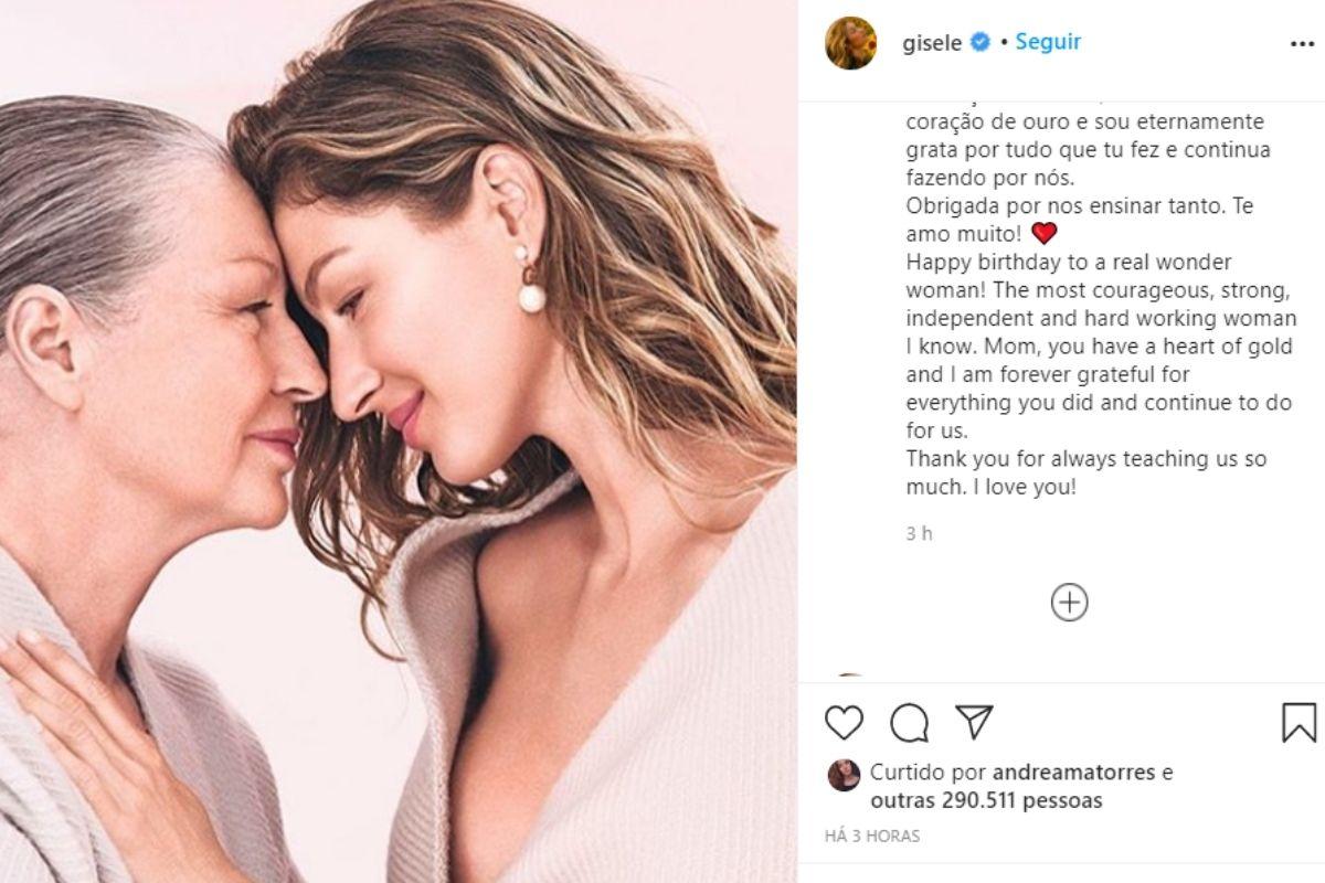 Gisele Bündchen compartilhou nas suas redes sociais nesta quinta-feira, 23 de julho, uma homenagem para a mãe. Vania Nonnenmacher faz aniversário e está completando 72 anos. Na foto, mãe e filha aparecem de perfil com os rostos próximos, o que reforçou ainda mais a semelhança física entre as duas! “Vocês são tão parecidas como espelho e reflexo!”, chegou a escrever uma fã.